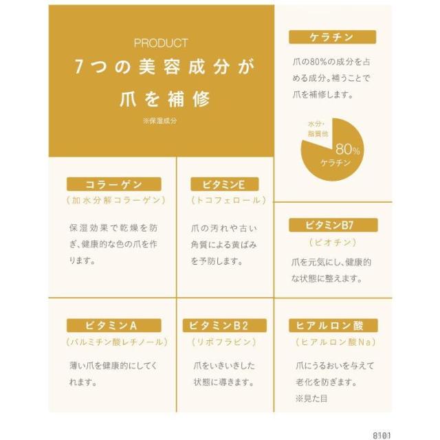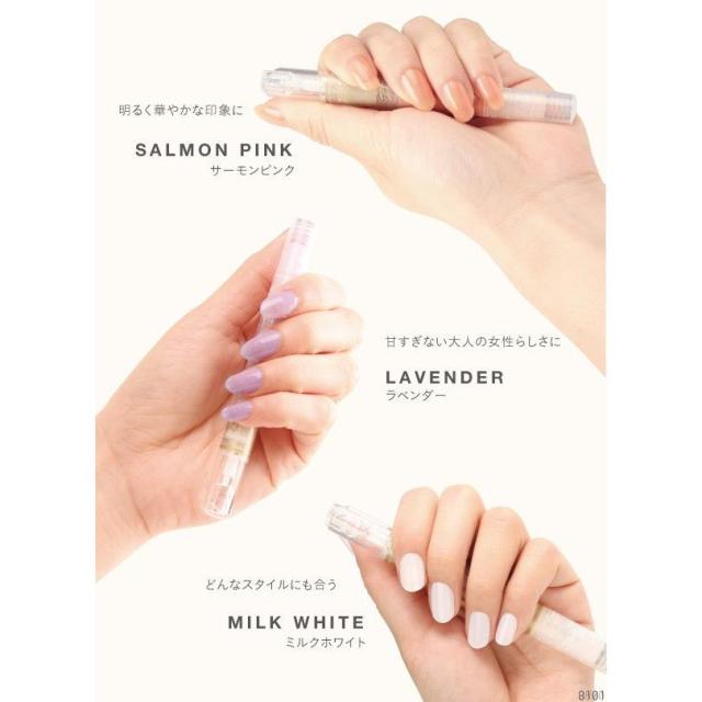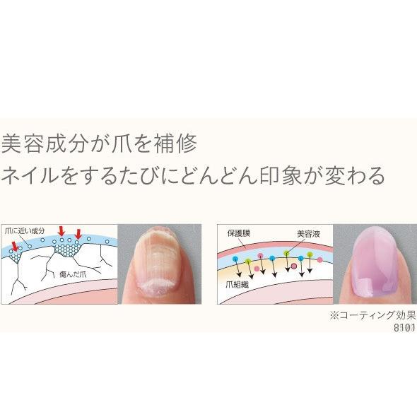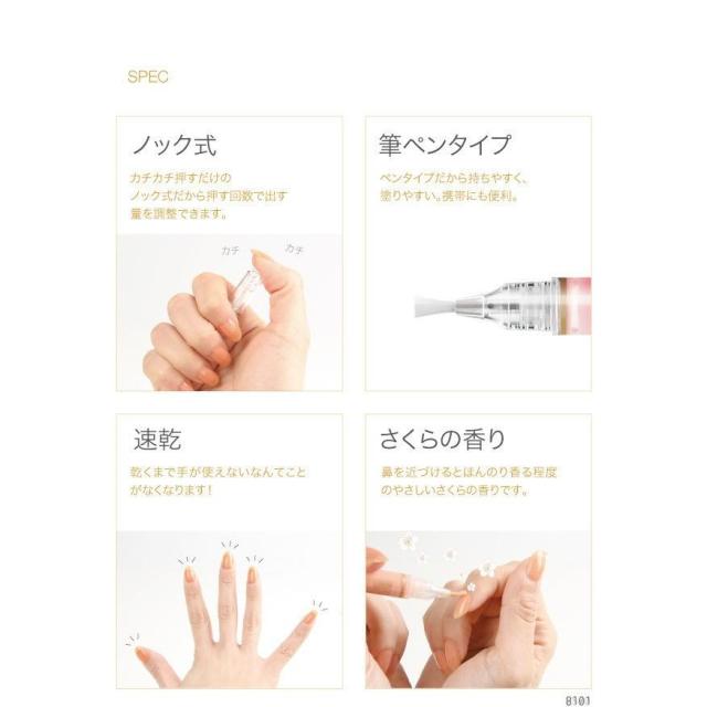 ネイルを楽しみながら同時にケア!爪の成分に近しい美容成分を配合し、ダメージがあったり老けた爪を潤い補修しながら、見た目にも美しい爪に仕上げます(コーティング効果)。自然な発色で上品にほんのり色づきます。筆ペンタイプで簡単に扱うことができ、いつでもどこでも爪ケア。お湯でスルッと落とせるため、リムーバーで爪を傷めることもありません。ほんのりさくらの香りがつけてあります。更にビタミンA、B2、B7、Eを追加配合しております。【カラー】 サーモンピンク、ラベンダー、ミルクホワイト、クリア、ほんのりピンク、ほんのりベージュ、ピンクベージュ 【内容量】 2.5ml 【生産国】 日本