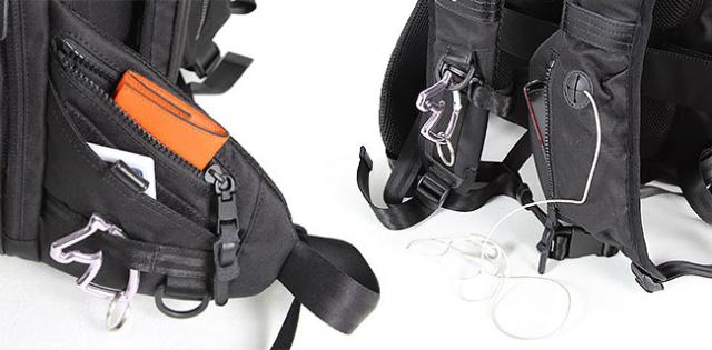 フロントのバックルベルト2本はスケートボード等を挟んで持ち運んだりもする使い方も。