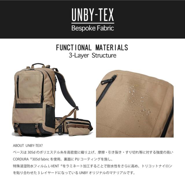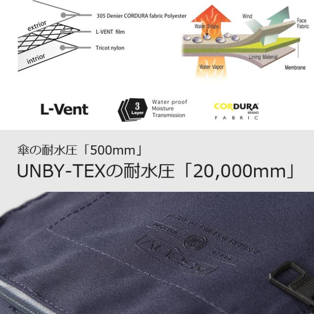 本体素材にはタテ・ヨコに305dの特殊ポリエステル糸を使用したCORDURA 305D fabric を使用している為、摩擦・引き裂き・擦り切れ等に対する強度を備えています。また、裏面に L-VENT 加工(3レイヤー)を施している為、「水蒸気を通し、雨風を通さない」耐水圧20,000mm以上の透湿防水性素材となっております。