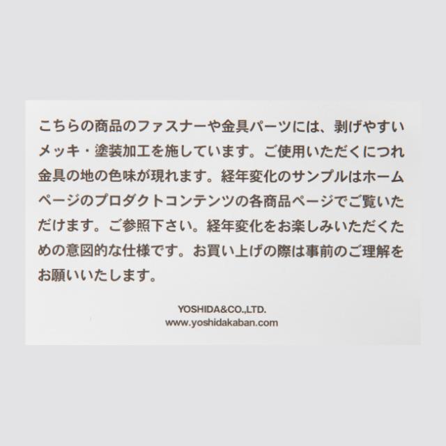 | 耐久性と耐水性に優れた2種類の異なる素材を組み合わせ、無骨でスタイリッシュなデザインが魅力の「HEAT(ヒート)」シリーズ 車のエアバッグや防弾チョッキにも使われる耐熱・耐摩擦・引裂強度に優れた66ナイロン糸で織り上げた日本製のバリスターナイロンをメイン素材にしています。一部分に工業用資材として用いられる耐水性の高いターポリン生地を使用しています。黒一色のワントーンでありながら、異なる質感の生地を組み合わせることでコントラストの効いたスタイリッシュなデザインに仕上げています。 随所にミリタリーのギミックを加え、ナイロンテープを一定間隔で縫製することでポーチや小物を取り付けられるPALS(パルス/Pouch Attachment Ladder System)を採用しているのもポイントです。カラビナやウォレットチェーンなどでお手持ちの小物をコーディネートできるように、本体にはDカンや二重リングも取り付けました。 バッグ本体には高密度に織り上げた厚手のナイロンテープを要所に配し、生地のたるみを防止した立体的なシルエットとハンドリングの良さを与えています。 ポーチとウォレット以外の全型にヌメ革の着脱式キーホルダーとPORTERの刻印入りマグライトが付属します。(※マグライトには保証書・キーホルダー・電池・アテンションが付属し、専用ケースにまとめています。) |