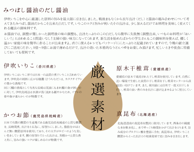 原材料名 しょうゆ(大豆・小麦を含む・遺伝子組み換えではない)・アミノ酸液・煮干鰯・鰹・鯖・真昆布・椎茸・本みりん・砂糖・食塩・酵母エキス・調味料(アミノ酸等)・酒精・VB1