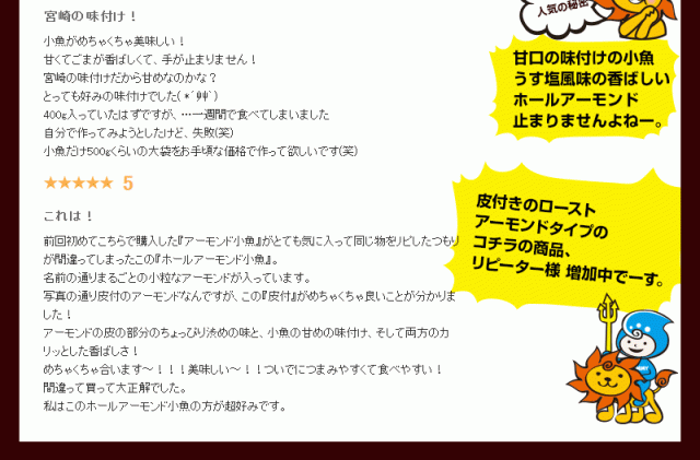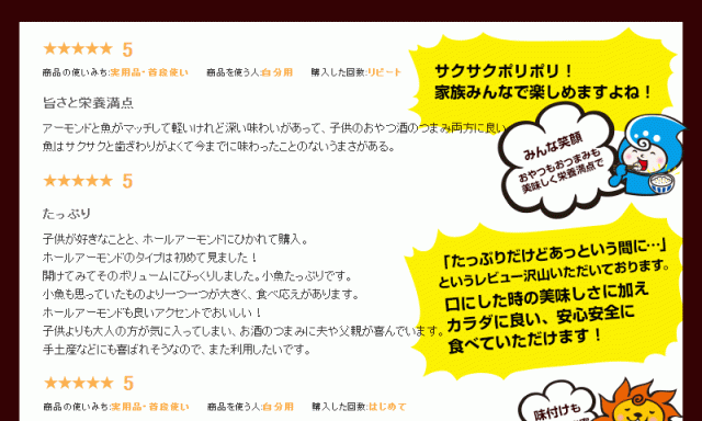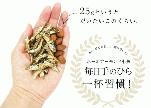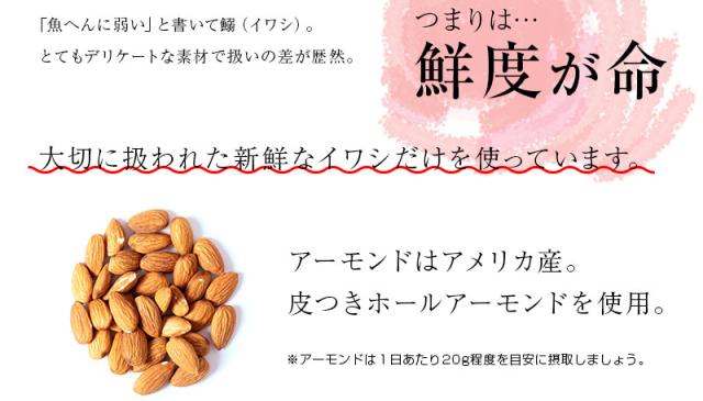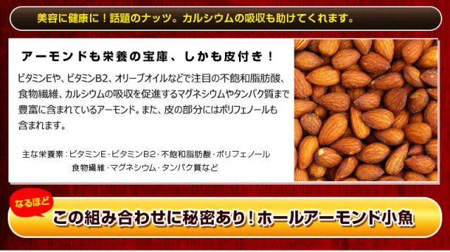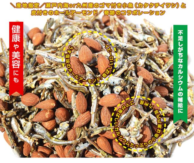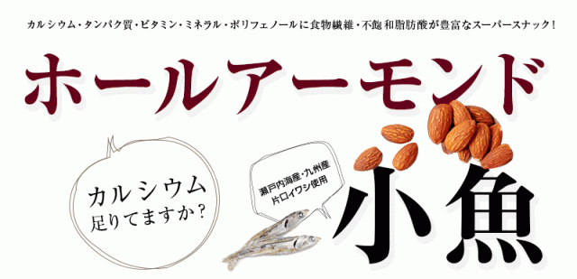 原材料名 アーモンド(アメリカ産)、煮干し(いわし(国産)、食塩)、砂糖、ごま、食用油脂、食塩、しょうゆ、澱粉分解物/調味料(アミノ酸等)、(一部に小麦・大豆・アーモンド・ごまを含む)