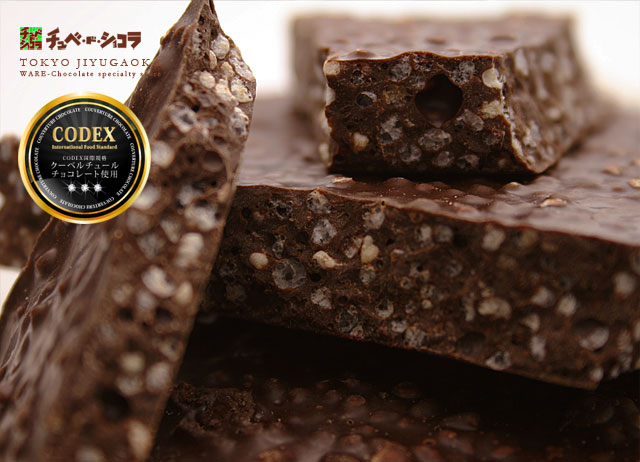 クーベルチュールチョコレートの最大の特徴は、一般のチョコレートでは味わえないその口どけにあります。その口どけの元となっているのが、チョコレートの原材料であるカカオバターです。 国内の一般的なチョコレートは、このカカオバターの代わりに食物性油脂を使用していることがほとんどです。国際基準のクーベルチュールチョコレートは、「総カカオ固形分35%以上、カカオバター31%以上、無脂カカオ固形分2.5%以上、カカオバター以外の代用油脂は使用不可」など規定があります。チュべ・ド・ショコラの割れチョコは、このCODEX国際規格をクリアした純粋なクーベルチュールチョコレートのみを使用しています。