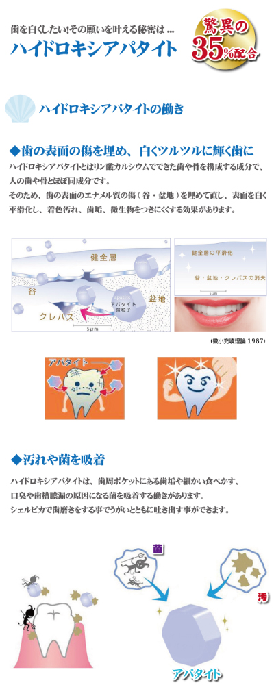 【薬効成分】生薬の一種である甘草(カンゾウ)を原料とした成分グリチルリチン酸ジカリウムを配合。優れた抗炎症作用で歯周炎を予防。 【甘味料】サッカリンなどの合成甘味料は配合せず、キシリトールを配合。 【香料】合成香料は配合せず、天然精油であるハッカ油を配合。 【洗浄成分】ラウリル硫酸ナトリウムや合成界面活性剤は配合せず石けん素地を配合。 【防腐剤】パラベンを使用せず、1,2−ペンタジオールを配合。 【その他の成分】濃グリセリン、ソルビトール、キサンタンガム。 【容量】80g 本商品は、2016年2月6日、4月8日、7月14日に歯磨き粉デイリーランキングで第1位を獲得しております。 ◆ 先生方のコメント ◆ ■札幌 浦本歯科医院 浦本洋一院長---今まで使っていたのとは違って爽快感があり、余計な混ぜ物が入っていないから使い易いです。特にホワイトニング効果や歯周病・知覚過敏などにも効果が期待出来ると思います。これからも予防歯科や治療の現場で推奨して行きたいと思います。 ■北海道大学 久保木芳徳名誉教授---人の歯や骨とほぼ同じ成分のため、歯の表面の小さなキズを修復します。