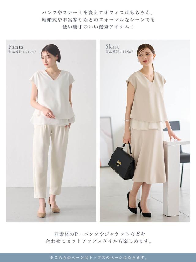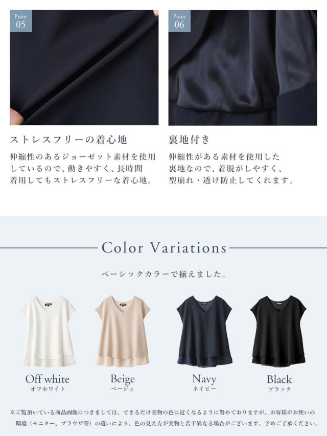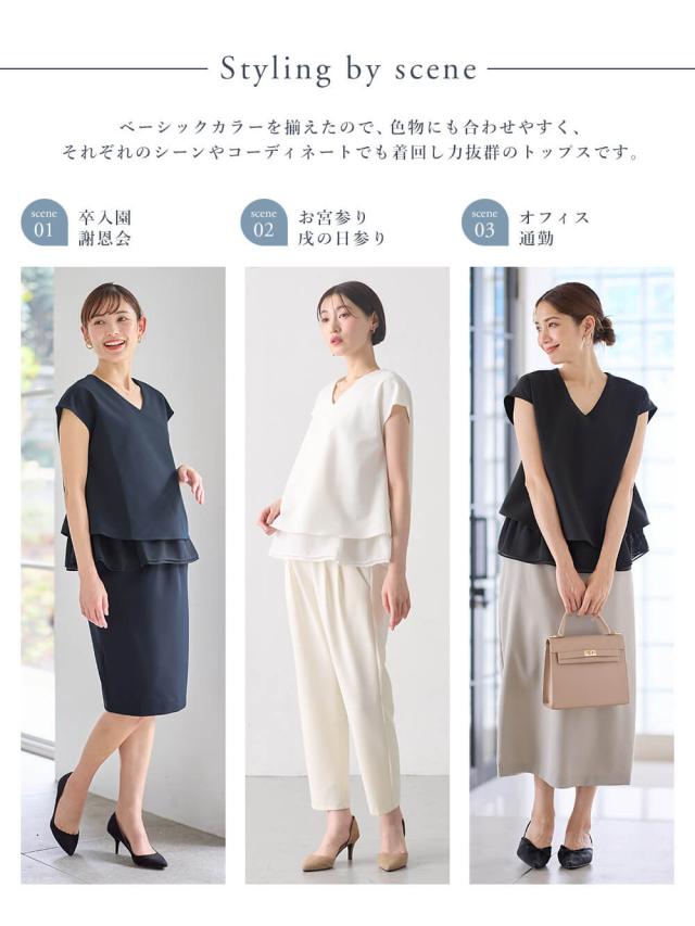 人気のストレッチジョーゼットトップスが、洗練されたシルエットで再登場。裾のシフォンが2重になっているので、マタニティボトムのリブが透けにくいです。開きがコンパクトなVネックやフレンチスリーブで上品に。同素材のパンツやスカートと揃えればトレンドのセットアップスタイルも楽しめます。