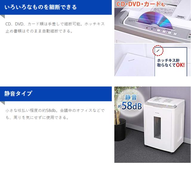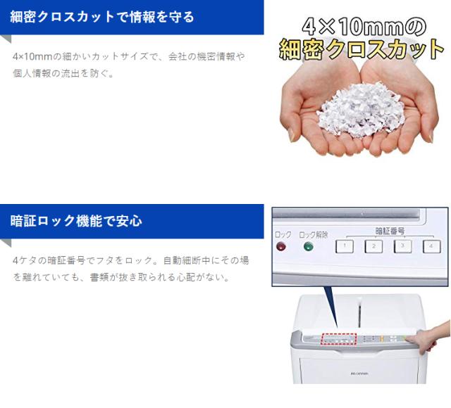 紙:クロスカット 約4×10mm、CD・DVD・プラスチック製カード類:3分割