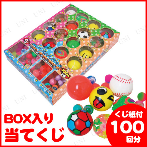 | 商品説明 | バラエティに富んだユニークなボールの当てくじです。引いた番号の商品がもらえる箱くじタイプ。100個の景品が付属しています。お祭りや縁日で子供が大好きなくじ引き。子供会や自治会、バザーやパーティーなどで盛り上がるイベントです。お子様向け店舗販促品としてもおススメ |