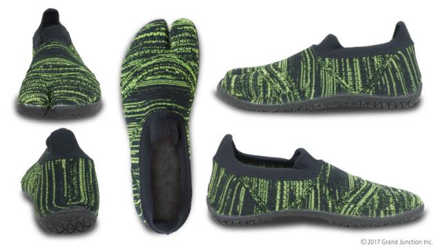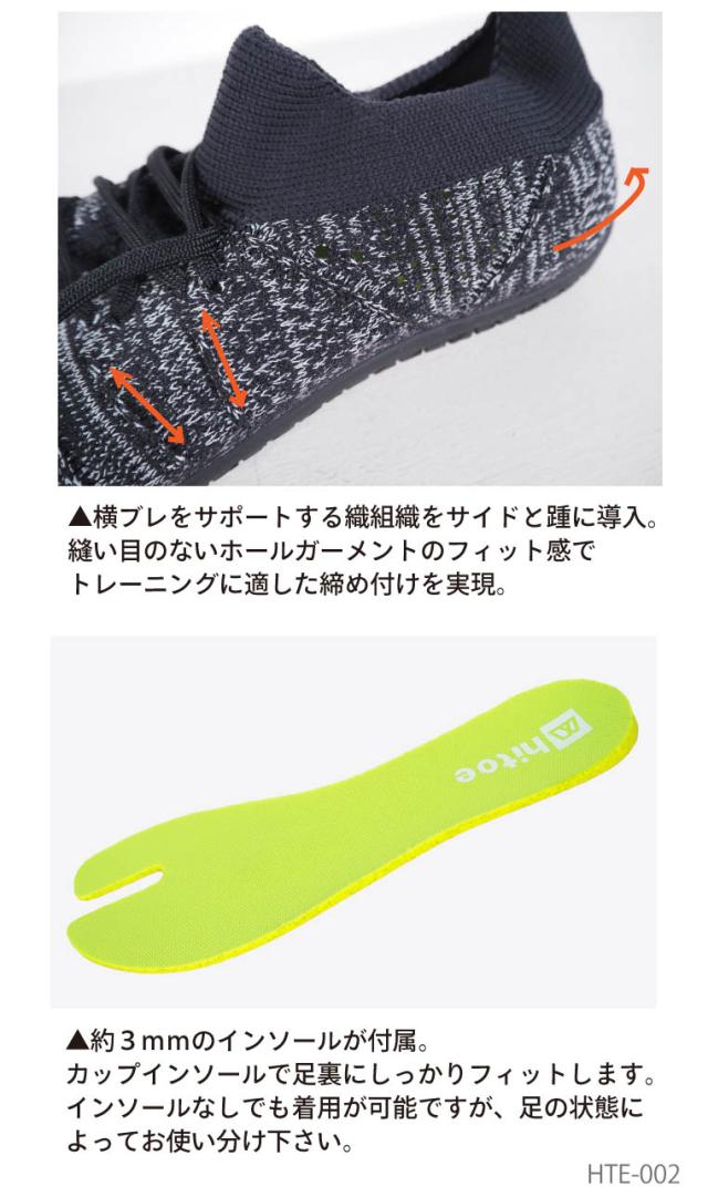 つま先が2つに割れている足袋型により足指を自由に動かし、鍛えることができます。 また、足指で地面をしっかりと掴む本来の歩き方を可能にします。 hitoe(紐なし)とhitoe+(紐の装着可能)の2種類を展開しています。 無縫製で編み上げられたアッパーは伸縮性に優れ、履くほどに足の形に合わせて伸び、ぴったりと足にフィットします。 踵、サイド部分は横ブレをサポートする織り方で、トレーニングに適した締め付けを実現。