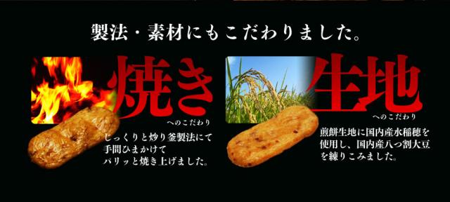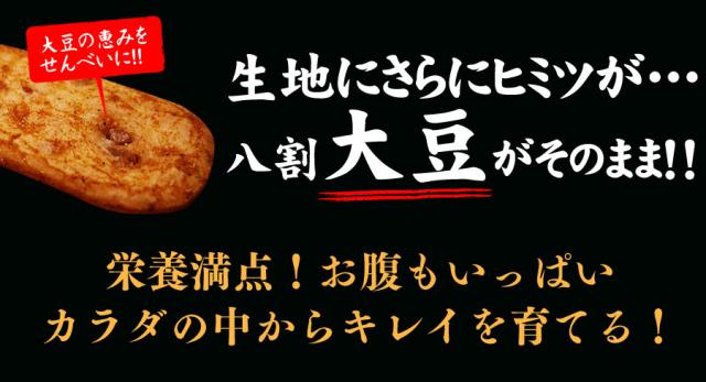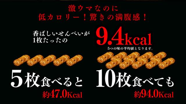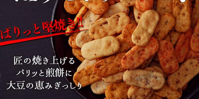 | 原材料 | うるち米(国産)、大豆、植物油、えび粉、醤油、おからパウダー、砂糖、豆乳パウダー、食塩、カレーパウダー、コンソメパウダー、バーベキューシーズニング、でん粉、みりん、昆布エキス、青唐辛子、ハバネロパウダー/調味料(アミノ酸等)、カラメル色素、酸味料、(一部にえび・小麦・牛肉・ゼラチン・大豆・鶏肉・豚肉を含む) |