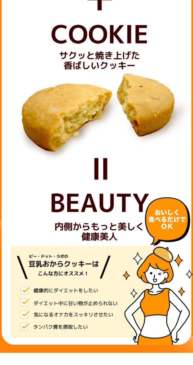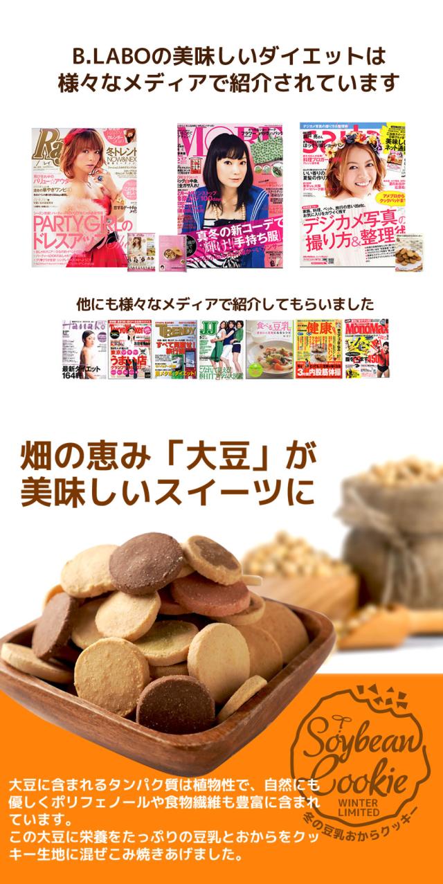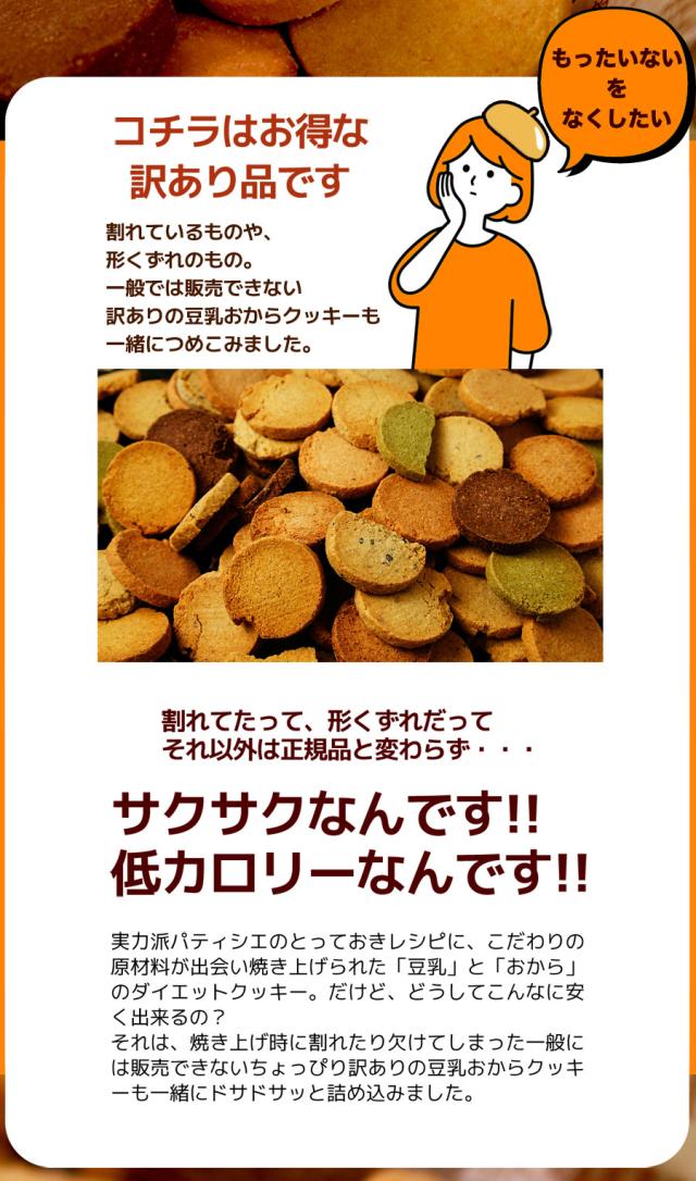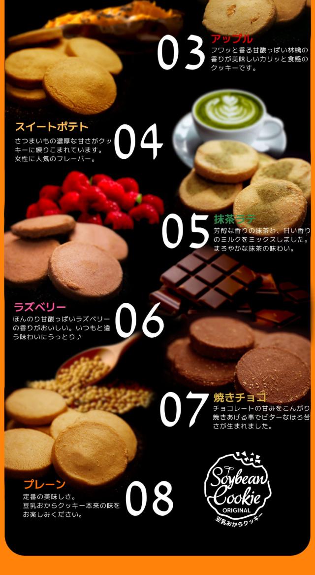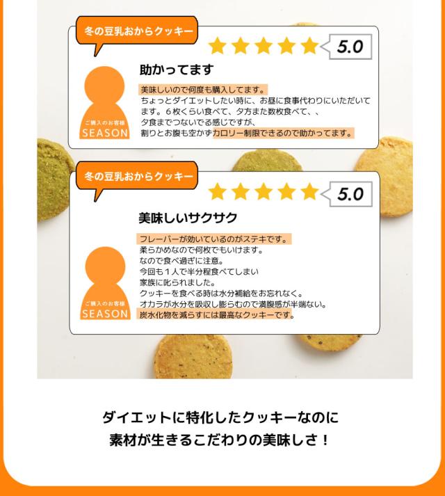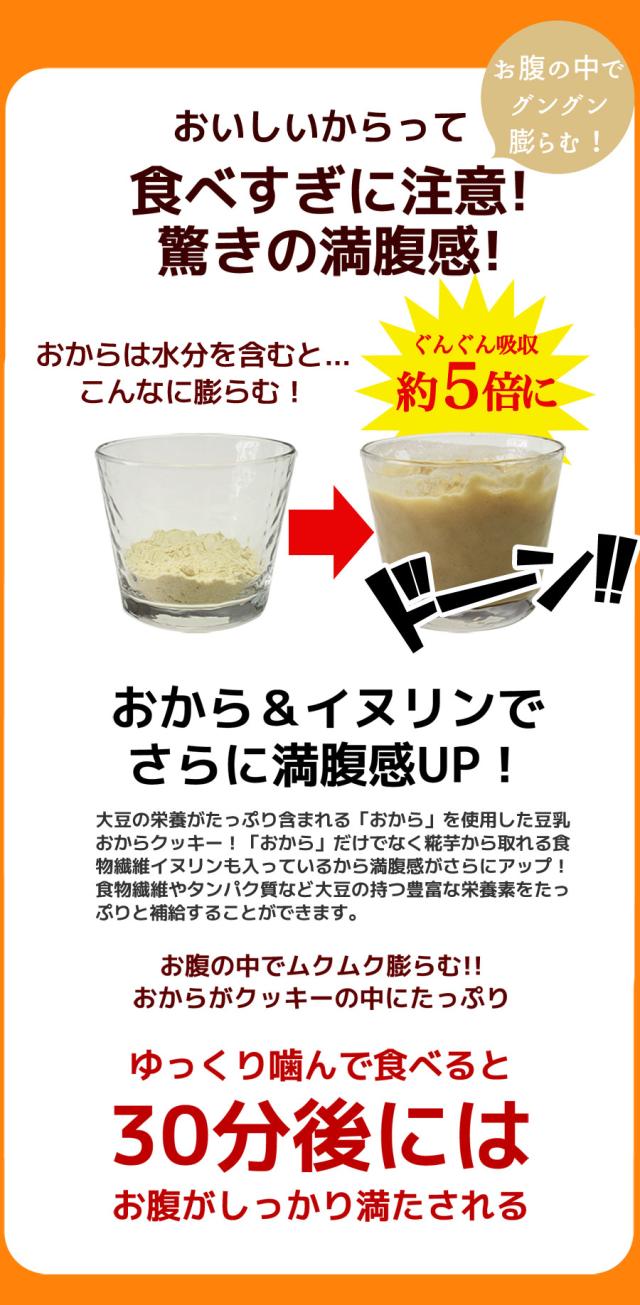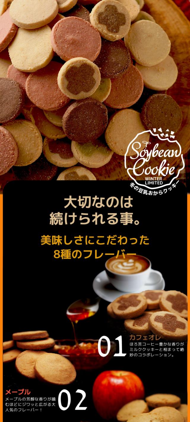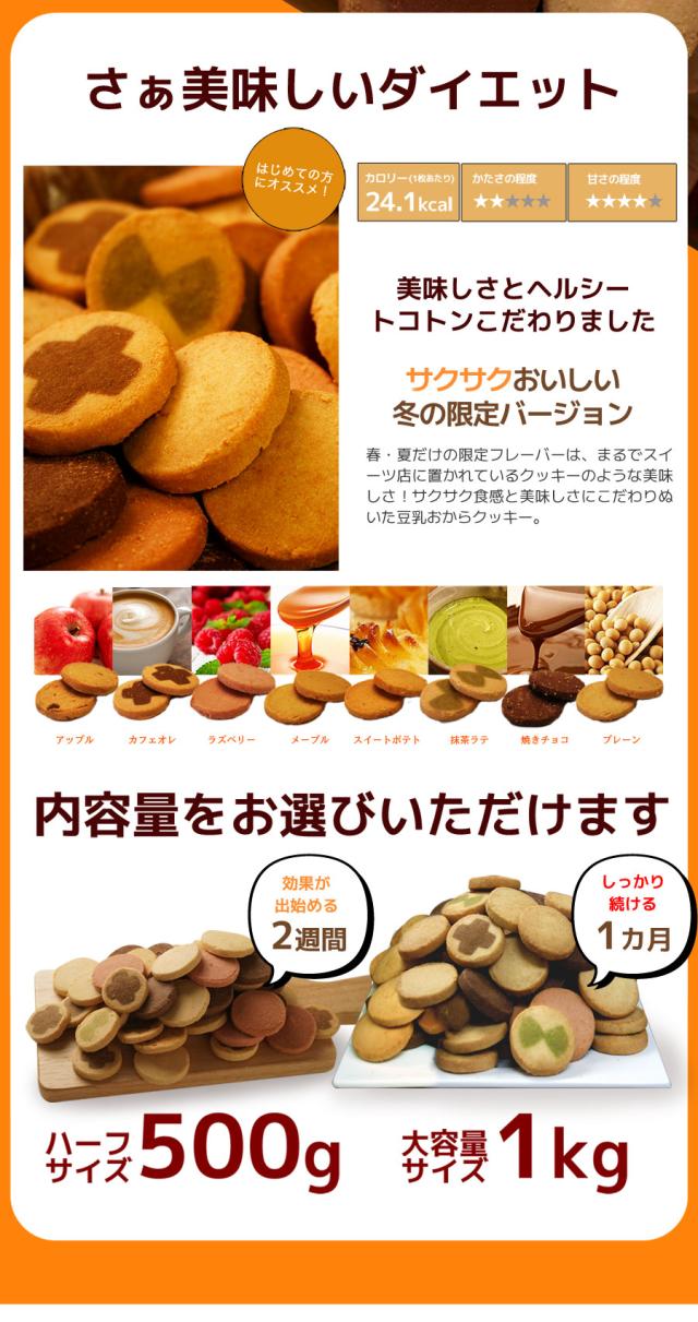 Wowma!ランキング1位!人気の豆乳おからクッキーがさらに美味しくさらにヘルシーに♪今しか食べれない限定フレーバー8種類!豆乳、おからに加え話題の食物繊維イヌリン、グルコマンナン配合でさらにツマリスッキリ!満腹感だってUPしちゃいました。まるでケーキ屋さんのクッキーのような美味しさ♪サクサク豆乳おからクッキーでダイエットの最高記録目指しちゃおう!1日1食5〜10枚のをたっぷりの水で置き換えて美味しいダイエットをはじめましょう