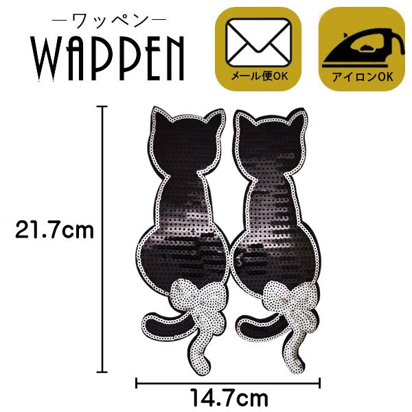 ワッペン アップリケ スパンコールワッペン アイロン接着 ビッグサイズ 縦21.7cm×横14.7cm 2匹のネコ リボン アニマル母の日 プレゼント ギフト