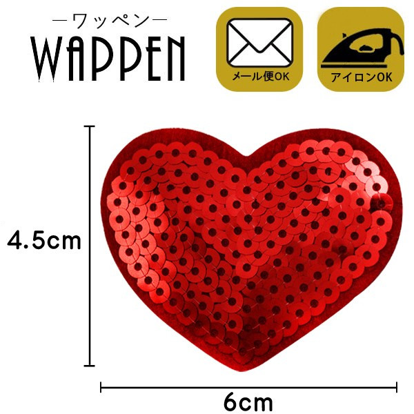 ワッペン スパンコール アイロン接着 縦4.5cm×横6cm ハート レッド キラキラワッペン アップリケ アイロンワッペン 手芸母の日 プレゼント ギフト
