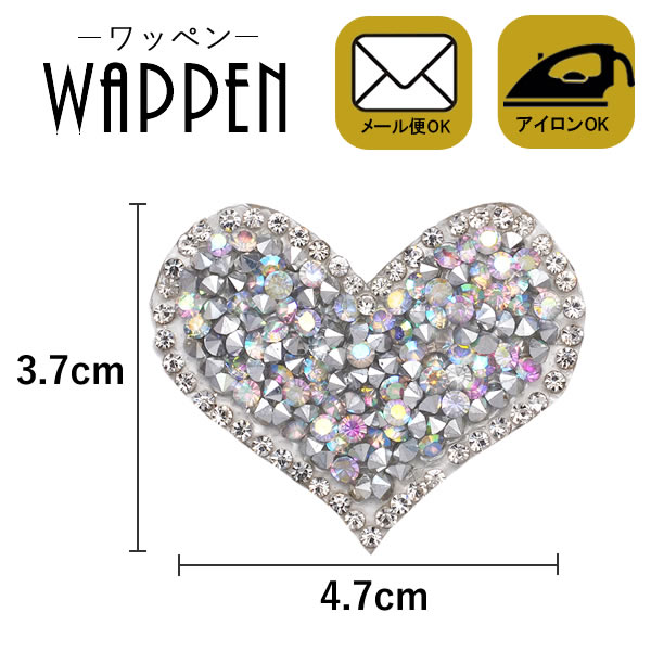 ワッペン ハート ストーンワッペン アイロン接着 ハートワッペン 縦3.7cm×横4.7cm シルバー ハート アップリケ【メール便可】 母の日 プレゼント ギフト