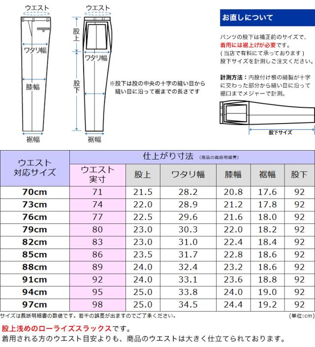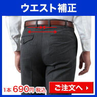 | ※スラックスと共に、買い物かごに入れてお申し込みください。 ※裾上げを希望されない方は、ご家庭のアイロンで裾上げができる「裾上げテープ」を無料でお付けいたします。 ※お直しを施した商品は、商品不良を除き、返品・交換をお受けできません。予めご了承ください。 |