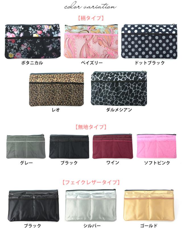 | カバン整理の必需品「バッグインバッグ」に大型サイズが新登場☆ コーディネートにあわせてバッグをチェンジした時。 あれっ?○○○がないー!入れ忘れちゃった!?なんて事ありませんか? そんな時に便利なのが、このバッグ イン バッグです! クッション入りだからipadやタブレットPCの収納にも! メンズ、レディース問わず使えるシンプルデザインです。 ■サイズ (約)横33cm×縦20cm マチなし、厚み約2.5cm ・メジャーにて外寸を計測しております。 ※海外生産の為、入荷時期により若干の誤差が生じる場合がございます。 ■仕様 ファスナー開閉 [外側] オープンポケット×4、ネットポケット×6 ■素材 無地、柄:ポリエステル フェイクレザー:ポリエステル、PU <注意事項> 平置きでの採寸の為、若干のサイズ誤差がございます。 海外生産の為、日本仕様と異なりファスナー及び縫製の甘さ等ある場合がございます。 また生産ラインによって生地色や柄などが写真と多少異なる場合がございます。 以上の点、あらかじめご了承の上お買い上げくださいませ。[1902] |