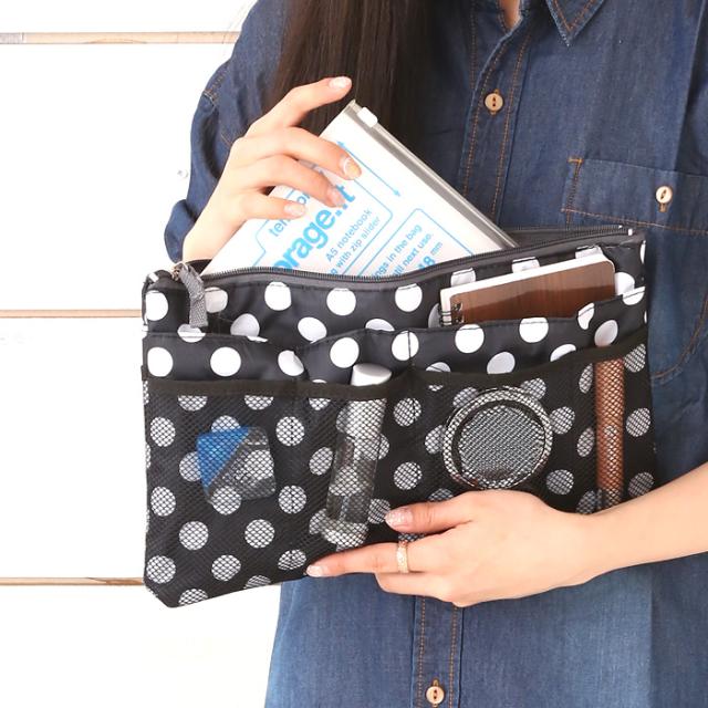 - 通勤で使用しているトートバッグ用に購入しました。思っていたより少し小さかったですがポケットが多く小物を分けて使えそうです。注文してから到着するまで早く良かったです。