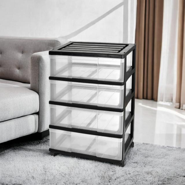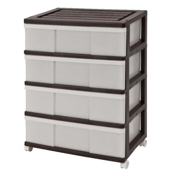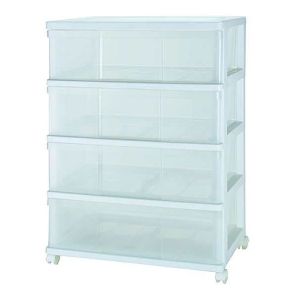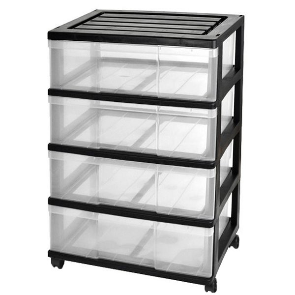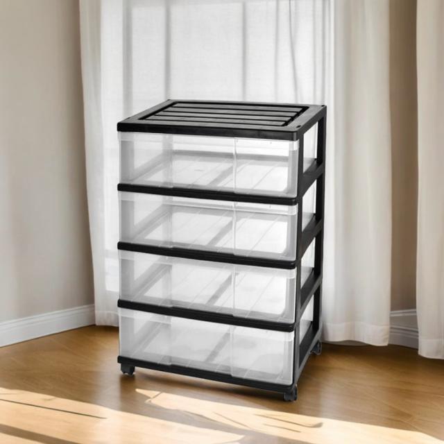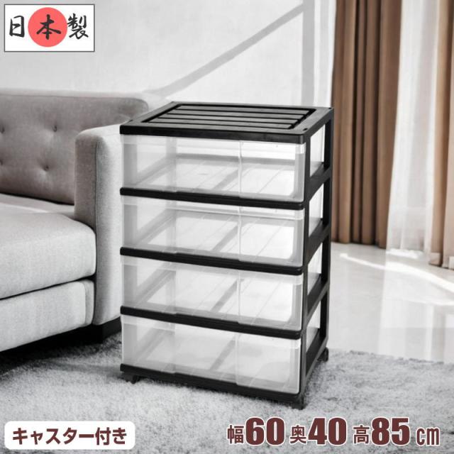 収納ケース 引き出し ワイド チェスト プラスチック 4段 幅60cm おしゃれ ブラック/クリア キャスター付き 日本製 送料無料