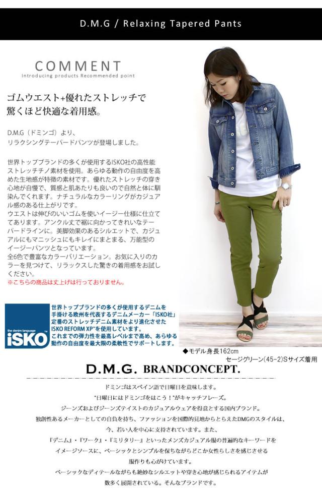 【当店DMG人気No.1】ドミンゴ DMG ISKO リラクシングテーパードパンツ 13-921t アンクル丈 クロップドパンツ ボトムス ズボン ゴムウエスト ストレッチ レディース 白 黒 イスコ ディーエムジー おしゃれ アーベン 普段使い
