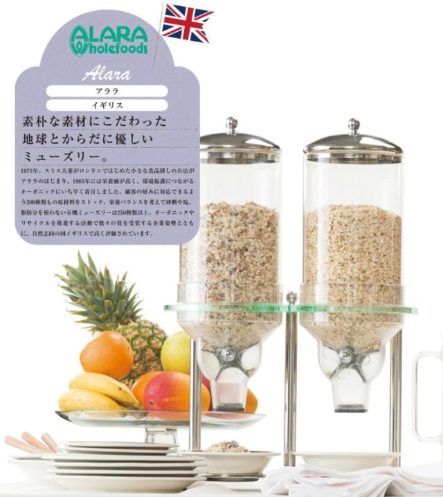 1975年、スミス夫妻がロンドンではじめた小さな食品卸しのお店がアララのはじまり。1983年には栄養価が高く、環境保護につながるオーガニックにいち早く着目しました。顧客の好みに対応できるよう200種類もの原材料をストック。栄養バランスを考えて砂糖や塩、脂肪分を使わない有機ミューズリーは250種類以上。オーガニックやリサイクルを推進する活動で数々の賞を受賞する企業姿勢とともに、自然志向の国イギリスで高く評価されています。