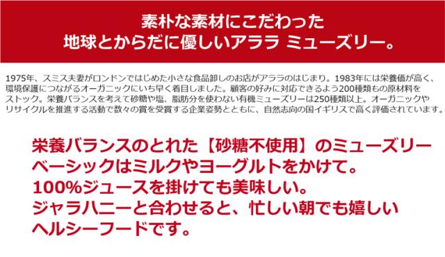 栄養バランスのとれた【砂糖不使用】のalara(アララ)ミューズリー。忙しい朝でもうれしいヘルシーフードです。