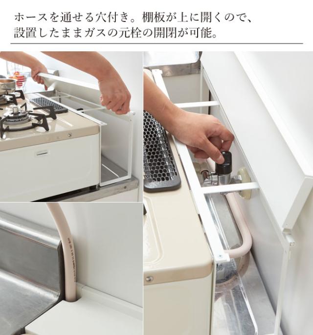 棚板が上に開くので、設置したままガスの元栓の開閉が可能。
