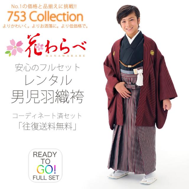 花わらべ ジュニア 羽織 袴 レンタル 小学生 卒業式 貸衣装 七五三 子供 男児 セット 往復送料無料 えんじ 紋付き