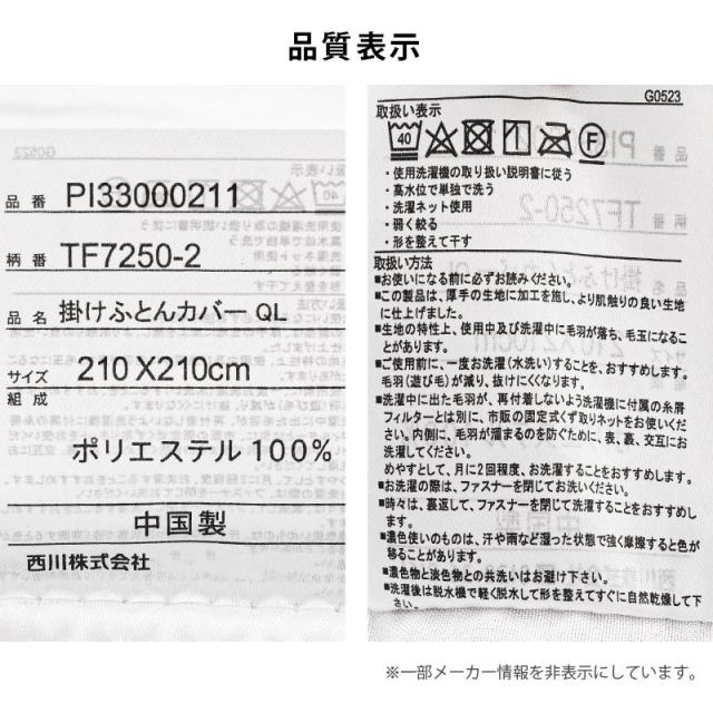 | ・豊富なcolor Variation 既存の9色に加えて、パープル、パープル&グレー、マスタード&グレーの新しく3色登場! キシキシしにくい滑らかマイクロフリースは保温性に優れた冬の布団の強い味方。お布団に入った時のヒヤッと感も抑えてくれます。 ・軽くて乾きも早い一般的に暖かカバーはSLで1.5〜2kgほどあるのですが、こちらはQLで約2.1kgと比較的軽め。乾きも早いので手軽にご家庭の洗濯機で洗えます。 ・これ1枚で毛布にも布団を入れずに薄手の毛布としても使えます。収納スペースがなくお困りの方は、カバーと毛布との兼用もおすすめです。 ・着脱カンタン!スナップボタン付き中の布団のズレ防止に付いているヒモが、今年度からなんとスナップボタン付きにグレードアップ!洗濯のたびにヒモを結ぶ手間が省けてカバーの付け外しが格段に楽になりました! ・安心品質をお届け眠りにもっと安心を。寝具の老舗大手メーカー、西川の商品です。製造・検品に高い基準を設けることで良品を皆様にお届けします。長い歴史のなかで培ってきた確かな技術をご堪能ください。 | |