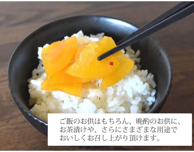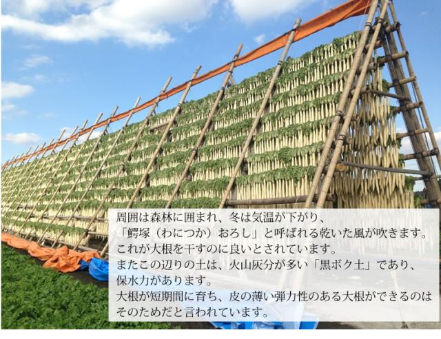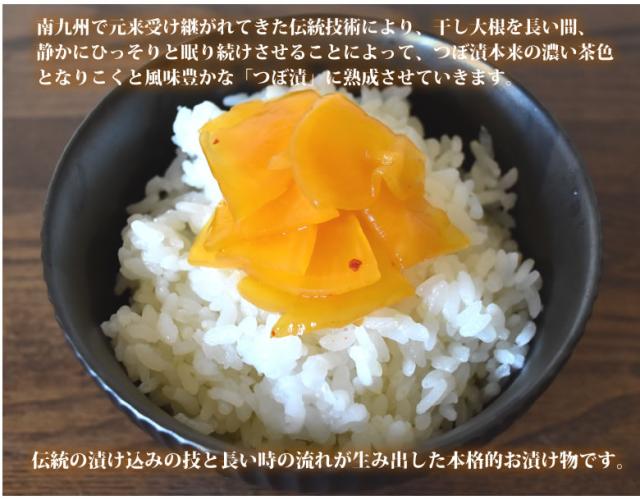 きざみつぼ漬は、太陽をいっぱいあびて、冬のからっ風にさらされた干し大根を、長期貯蔵し、発酵、熟成させることによって造り上げた昔さながらのつぼ漬きざみたくあんです。南九州で元来受け継がれてきた伝統技術により、干し大根を長い間、静かにひっそりと眠り続けさせることによって、つぼ漬本来の濃い茶色となりこくと風味豊かな「つぼ漬」に熟成させていきます。伝統の漬け込みの技と長い時の流れが生み出した本格的お漬け物です。