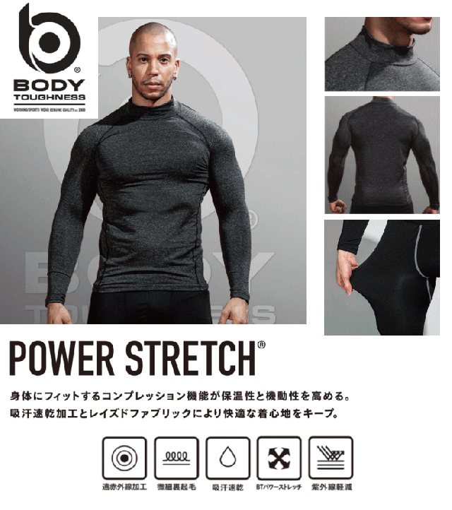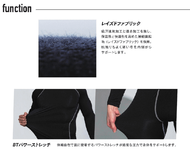 【機能】遠赤外線加工 微細裏起毛 吸汗速乾 BTパワーストレッチ 紫外線軽減