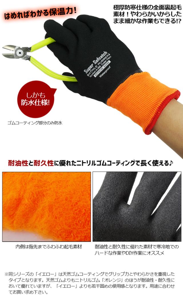 | 雪かきなど寒冷地での作業にも使用できる、極厚保温作業手袋です! 黒い部分はニトリルゴムダブルコーティングが施されています。強度・グリップ力・柔軟性のすべてに優れた加工手袋☆ もちろんラバー部分は防水仕様です。内側は手首から指先まで起毛素材で覆われていて、バツグンの保温性です!! | ||||||