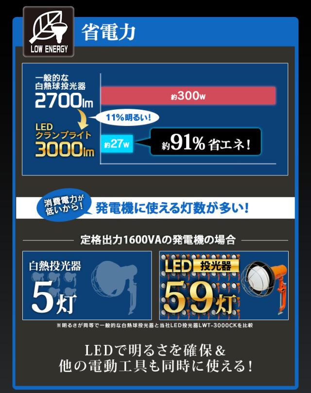 消費電力が少ないから、ひとつの発電機でたくさん使える。