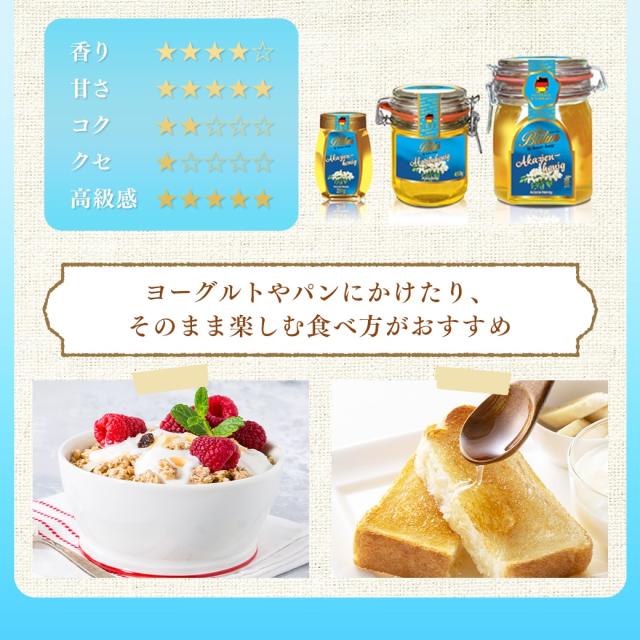 - 私も瓶容器とアカシアに惹かれました。普段は百花蜜の国産を他店で買ってますがこちらの商品は本当にクセも無く美味しい甘い蜂蜜でした。またこちらの百花蜜も気になります!発送も早く助かります。