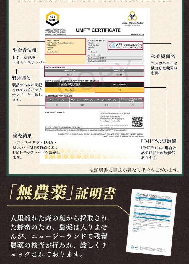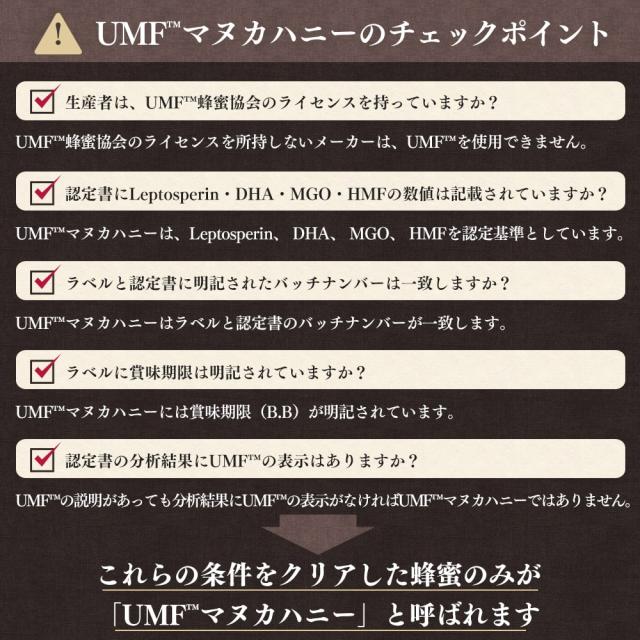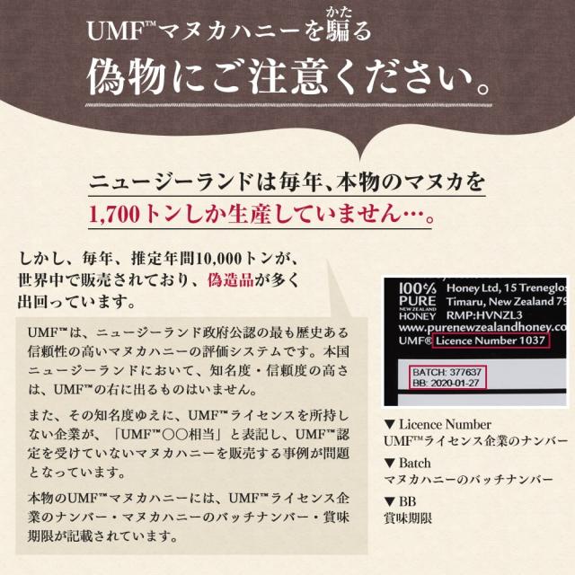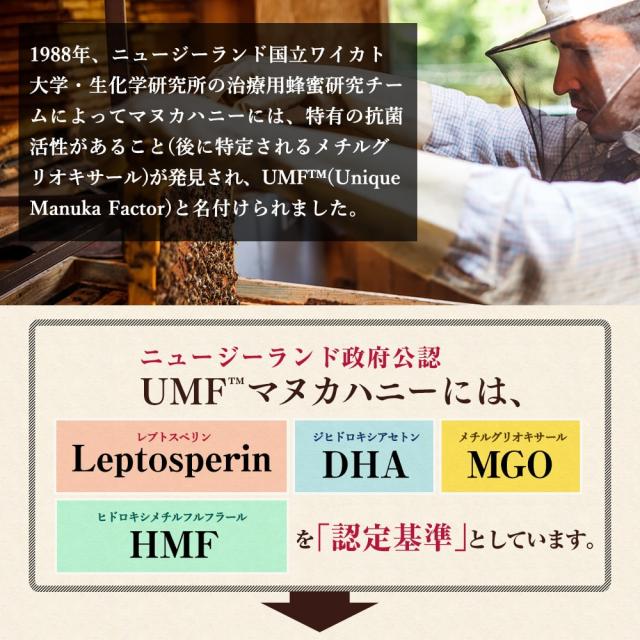 ・ニュージーランド政府公認のUMF(Unique Manuka Factor Honey Association)のライセンスを持った正規の高品質マヌカハニーは、従来の蜂蜜とは違う特別なパワーを備えた、健やかな体作りに効果があると話題となっている希少なはちみつです。