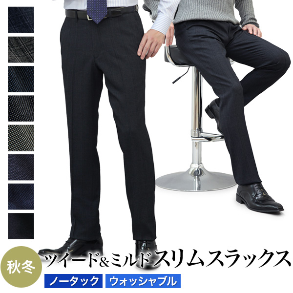 スラックス スリム ノータック メンズ ツイード&ミルド調 ストレッチ ローライズ ウォッシャブル 秋冬 ビジネス カジュアル 暖かい オシャレ【クロネコゆうパケット】