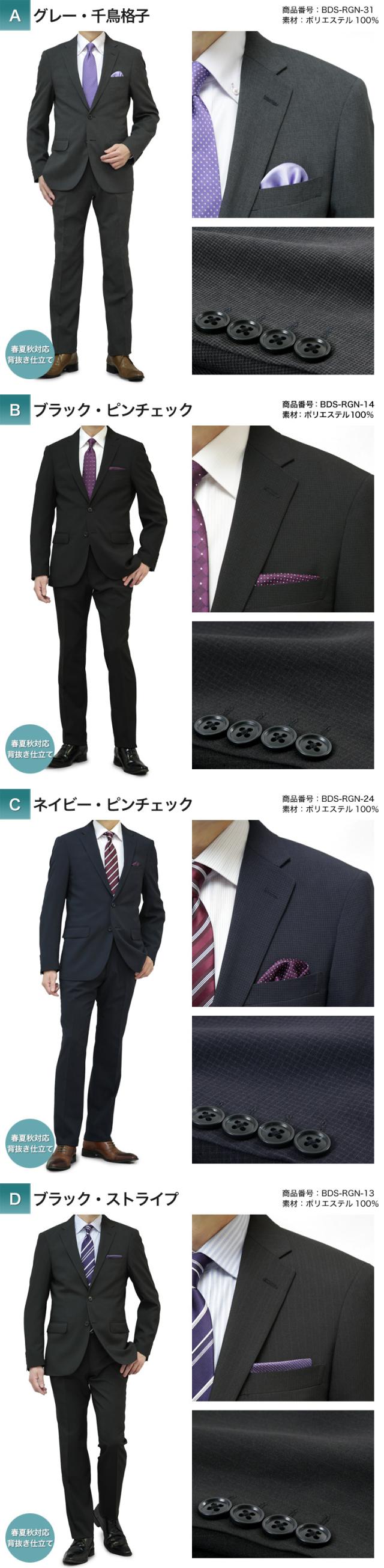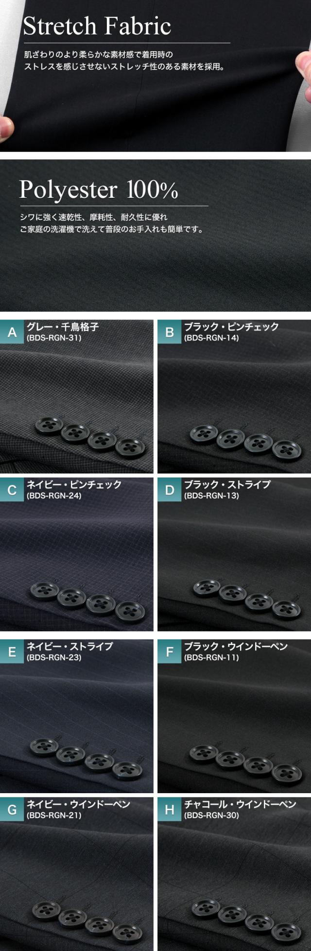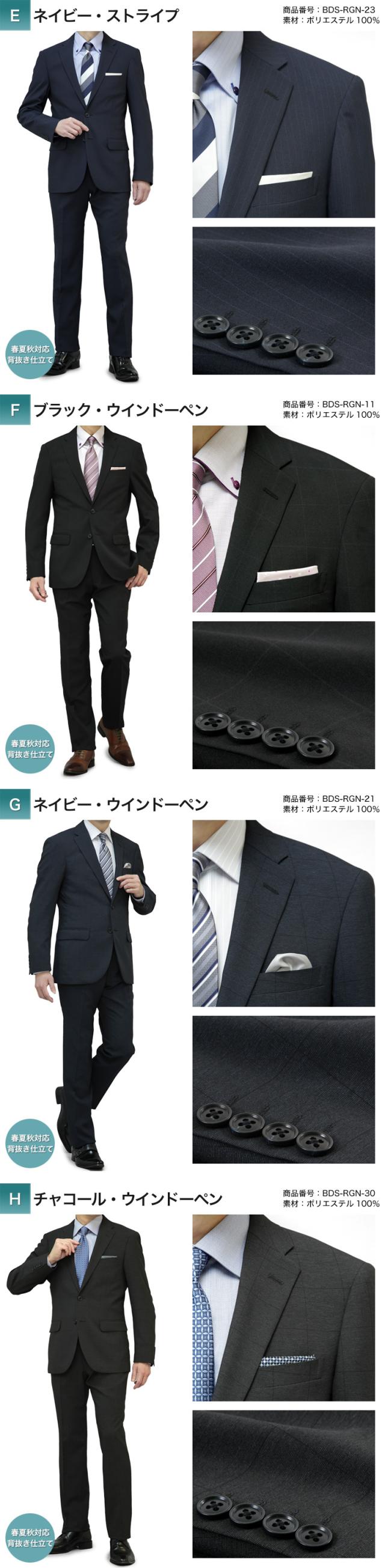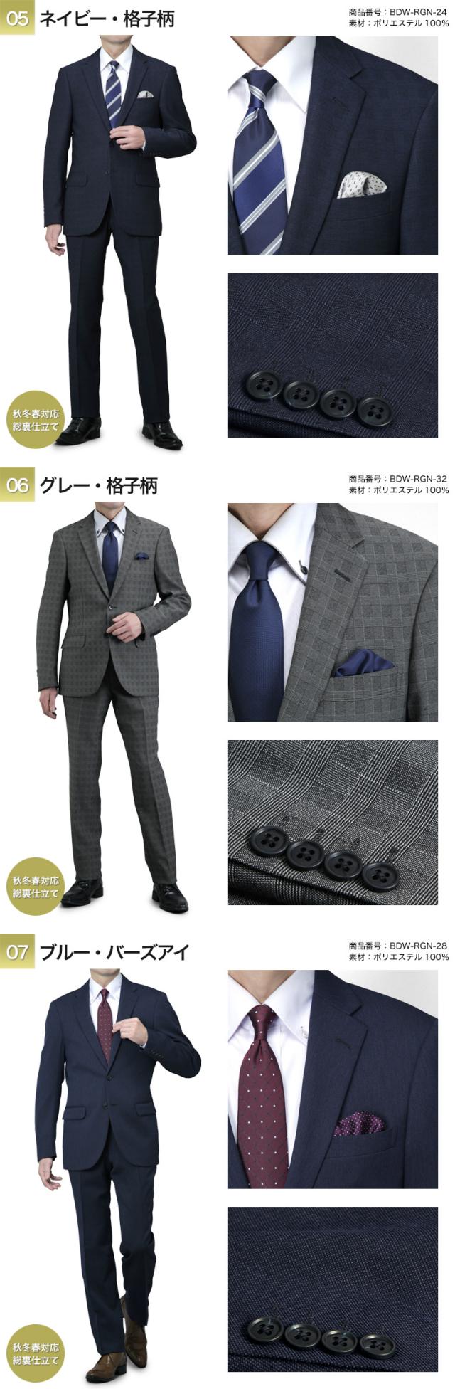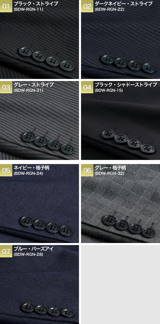 | ▼春夏秋対応 【A】グレー・千鳥格子(BDS-RGN-31) 【B】ブラック・ピンチェック(BDS-RGN-14) 【C】ネイビー・ピンチェック(BDS-RGN-24) 【D】ブラック・ストライプ(BDS-RGN-13) 【E】ネイビー・ストライプ(BDS-RGN-23) 【F】ブラック・ウインドーペン(BDS-RGN-11) 【G】ネイビー・ウインドーペン(BDS-RGN-21) 【H】チャコール・ウインドーペン(BDS-RGN-30) ▼秋冬春対応 【01】ブラック・ストライプ(BDW-RGN-11) 【02】ダークネイビー・ストライプ(BDW-RGN-22) 【03】グレー・ストライプ(BDW-RGN-31) 【04】ブラック・シャドーストライプ(BDW-RGN-15) 【05】ネイビー・格子柄(BDW-RGN-24) 【06】グレー・格子柄(BDW-RGN-32) 【07】ブルー・バーズアイ(BDW-RGN-28) ※2025年7月より新たな色柄を追加して発売しております |