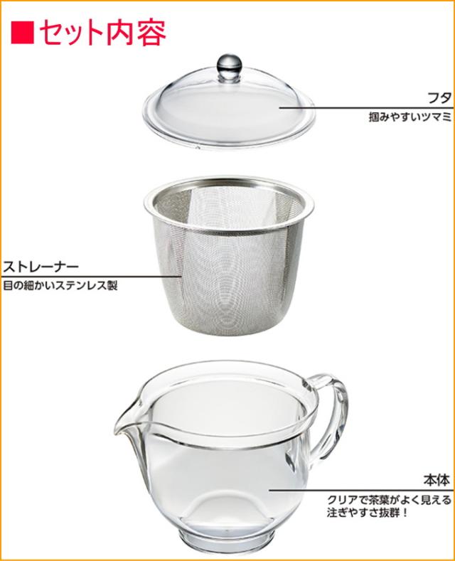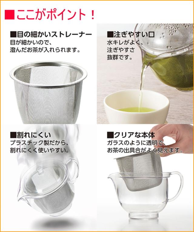 | 特徴 | ガラスのように透明でお茶の出具合がよく見える、プラスチック製の丈夫なティーポットです。 一人分に最適なかわいい飲みきりサイズです。 本体には哺乳瓶や医療部品にも使用される「トライタン」樹脂を使用しており、安全性が高く、落としても割れにくいのが特徴です。 ストレーナーが網目の細かいステンレス製なので、澄んだお茶を入れることができます。 食器洗い乾燥機にも対応しています。 |