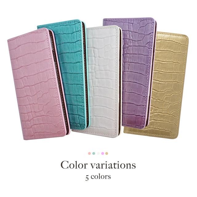 ■本体(外側)とストラップ:牛革(なめした皮革にクロコダイル模様をエンボス加工し、その上にエナメルコーティングをした日本国産皮革) ピンク・クリームミント・パープル・ゴールドのケースにはゴールドのラメ、ホワイトのケースにはシルバーのラメが施されています。 本体(内側):良質の牛皮革 ケース:PC(ポリカーボネート)またはシリコン