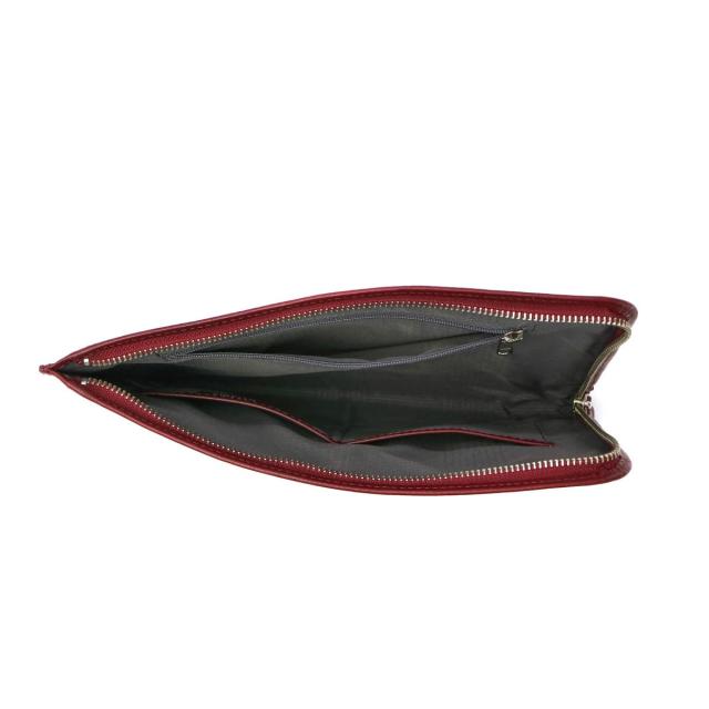 開閉部はL字ファスナー仕様でアイテムが出し入れしやすくなっています。メインルームはA5サイズに対応しており、薄マチながら長財布も入る収納力を備えています。