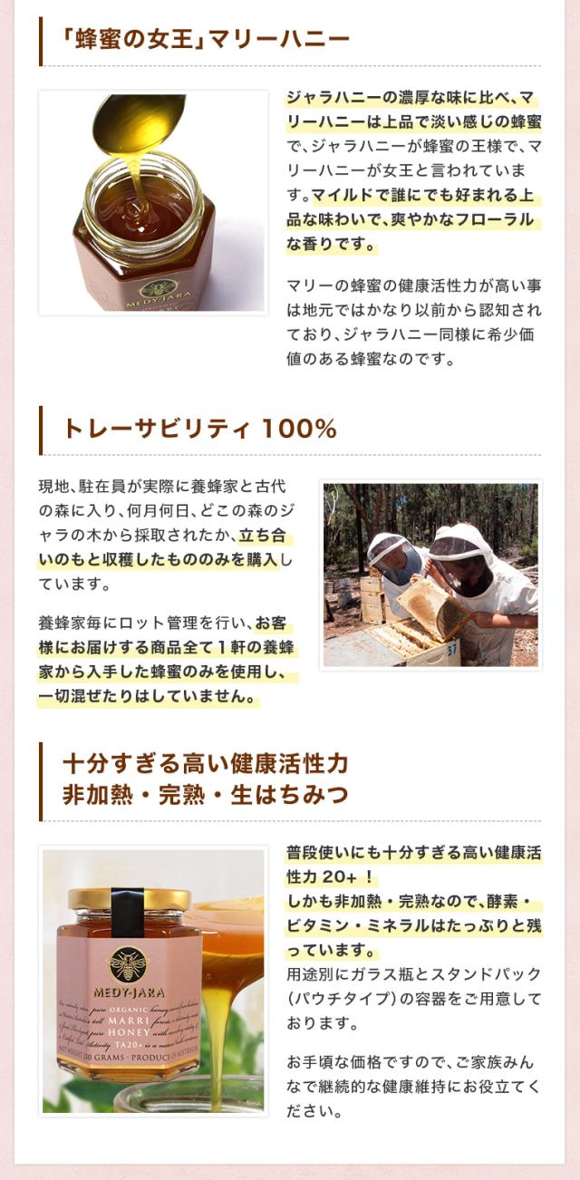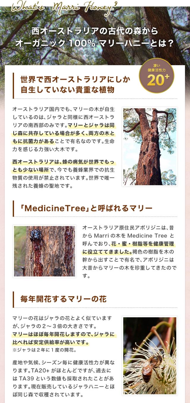 クリーンで安心・安全の西オーストラリアの太古の森に自生するマリーの木。先住民族のアボリジニは、昔からMarriの木をMedicine Tree (薬の木)と呼び、珍重してきました。季節の変り目の体調管理に、まさしくマリーハニーは天然のサプリメント!是非あなたの健康維持にお役立てください。
