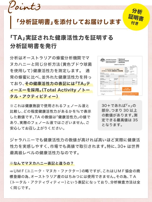 マヌカハニーと同様の検査方法で、オーストラリア分析機関より発行した証明書を添付してお届けします。