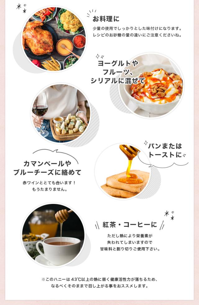 健康維持管理に1日数回、毎日続けて小スプーン一杯をそのまま口の中で溶かしながら、ゆっくりとお召し上がりください。美味しい蜂蜜として、ヨーグルトやフルーツ、シリアルに混ぜて、お料理やコーヒー・紅茶に入れてなど様々です。
