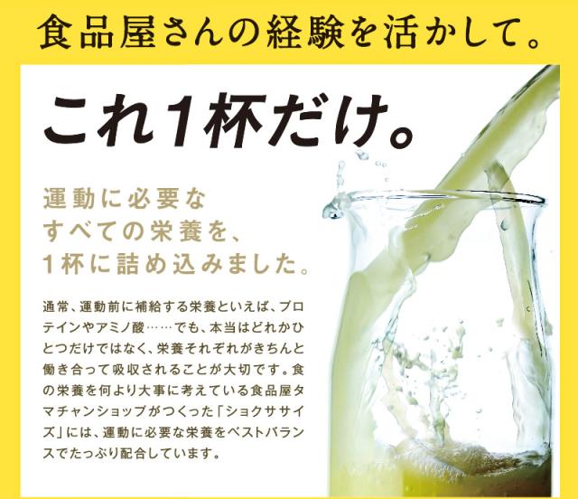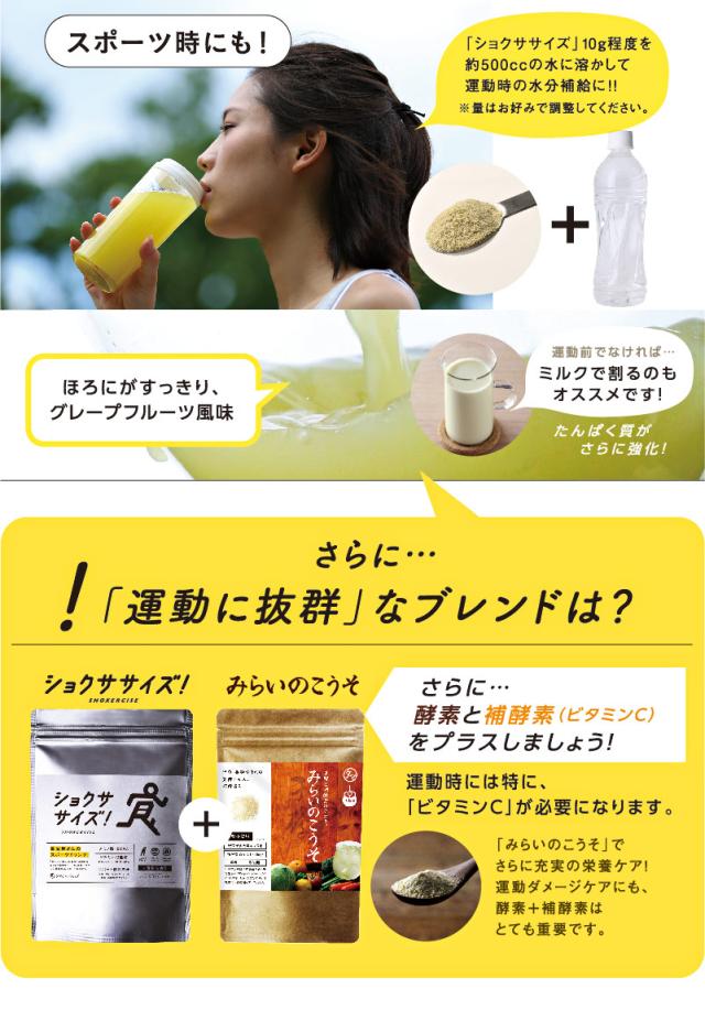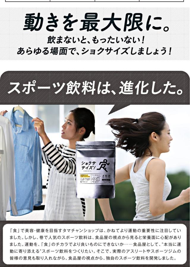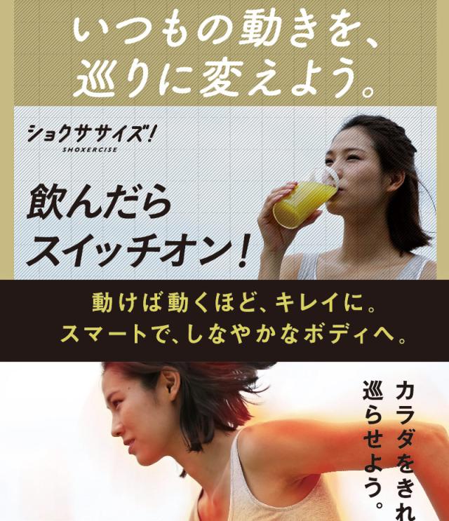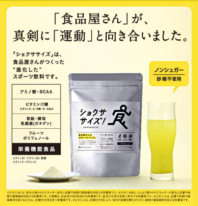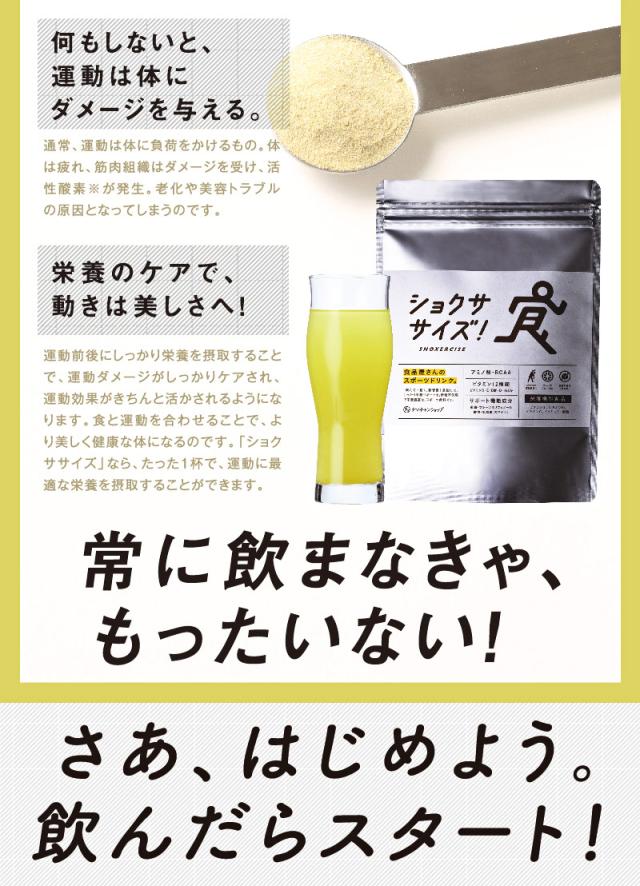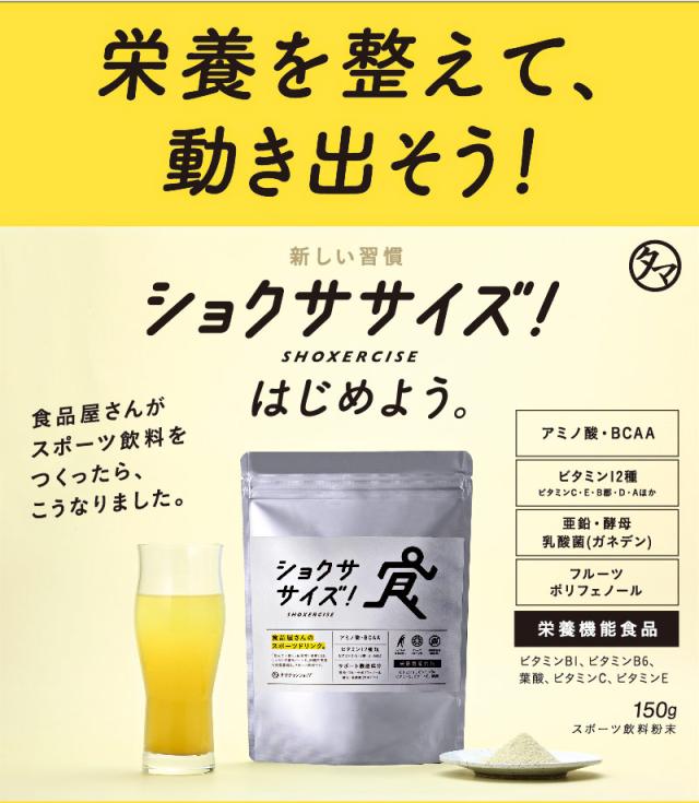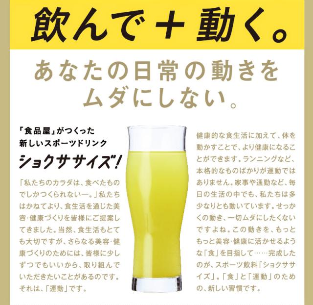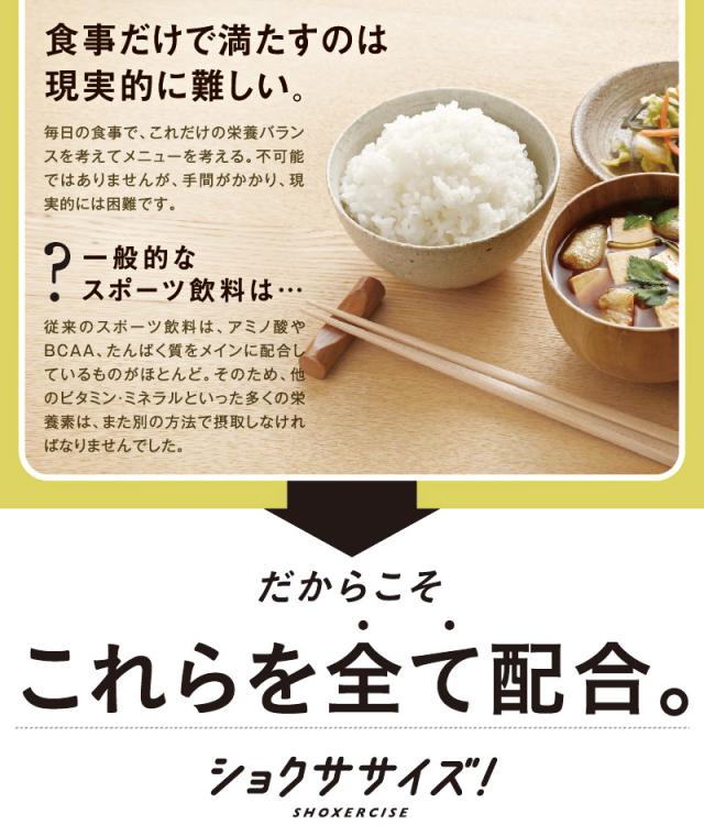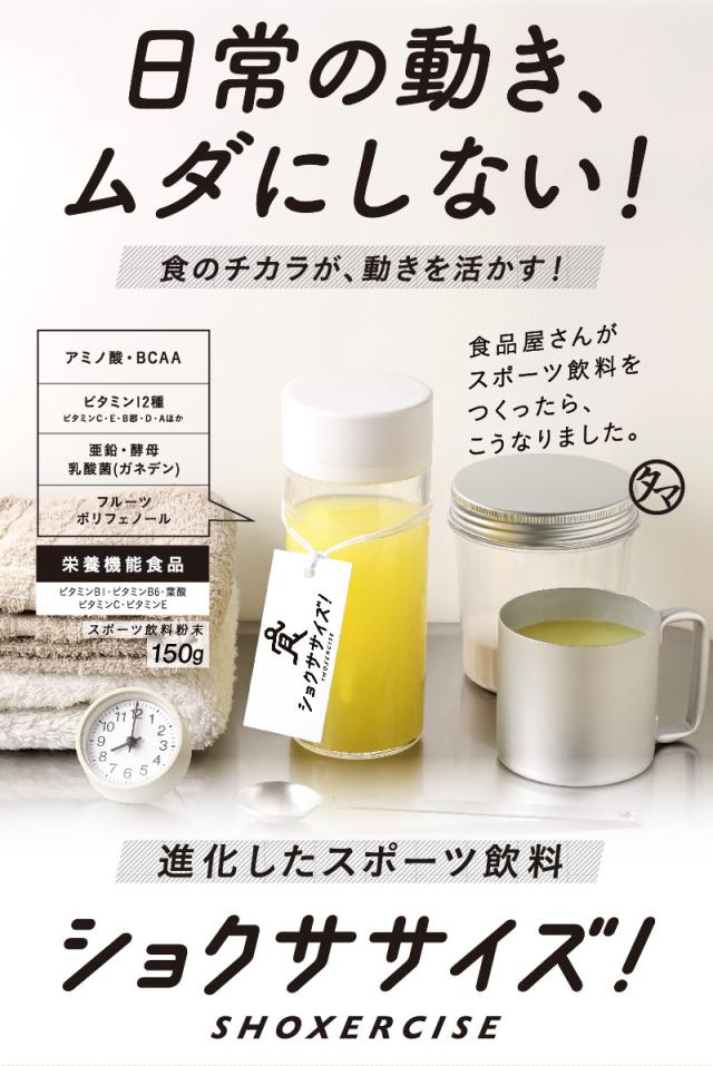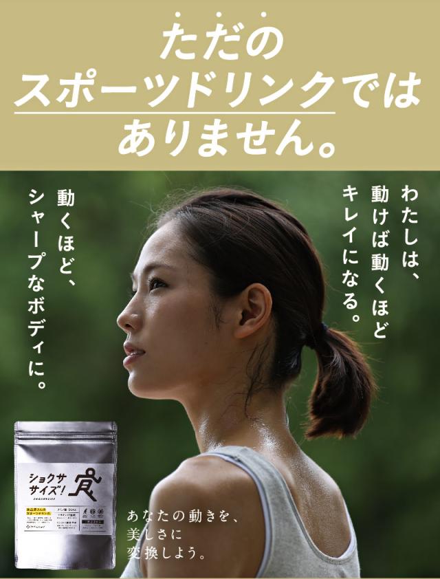 動けば動くほど、キレイになる。食品屋さんが作った砂糖不使用のスポーツドリンク! 美容・健康の上で重要になってくる基礎代謝。代謝を上げるには運動が必要不可欠!しかし、運動をしっかり体に活かすためには、たんぱく質やアミノ酸、ビタミン・ミネラルなどの様々な「栄養のサポート」がとても重要なんです。 ショクササイズは、運動に必要なすべての栄養をバランスよくたっぷり配合しています。 本格的なスポーツから、お掃除・通勤など日常的な動きも、ショクササイズを取り入れてしっかり栄養補給・巡りのサポートを。