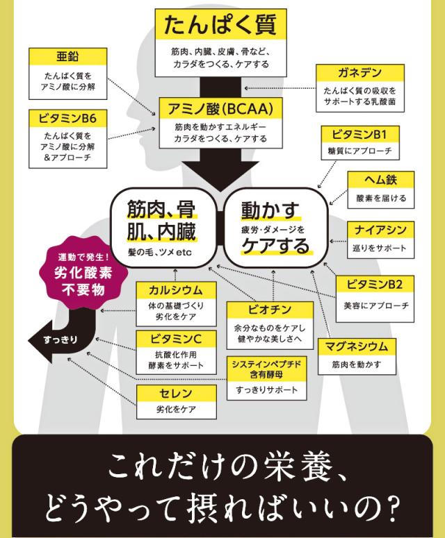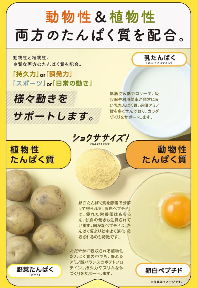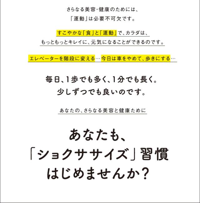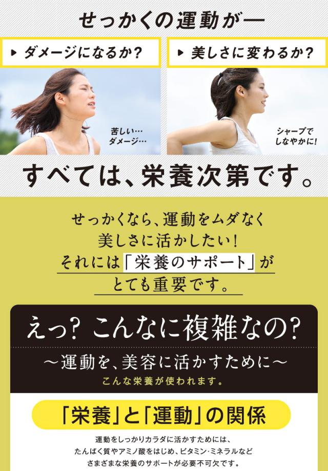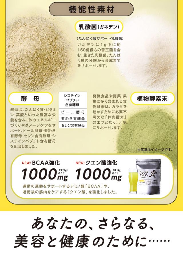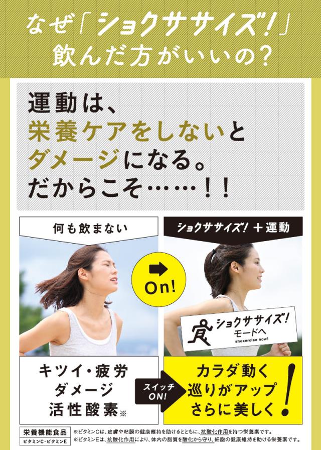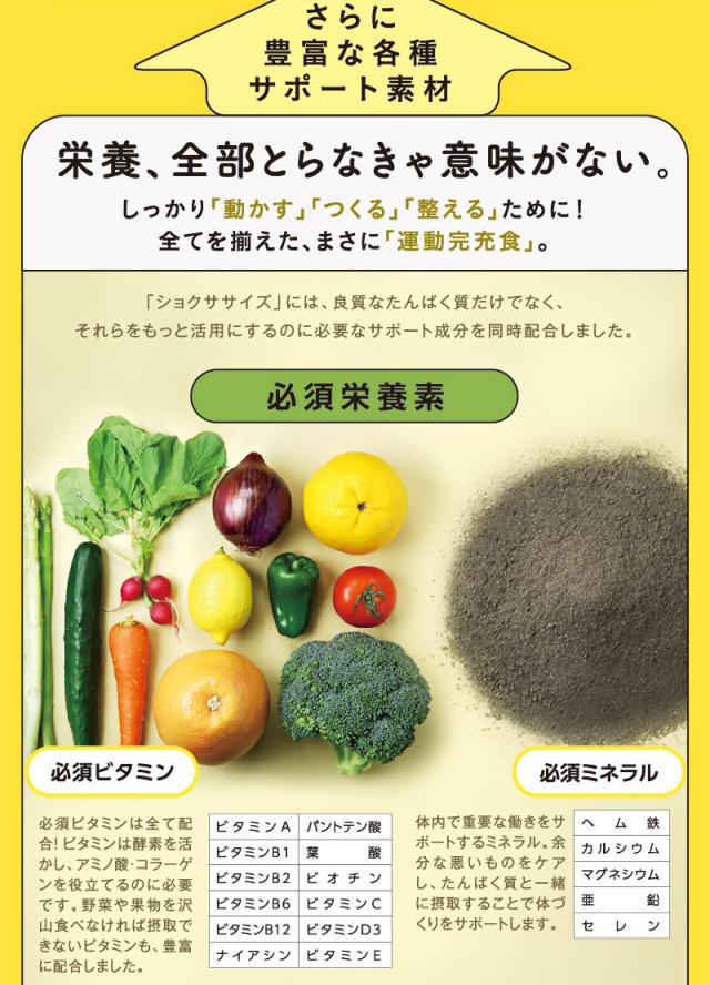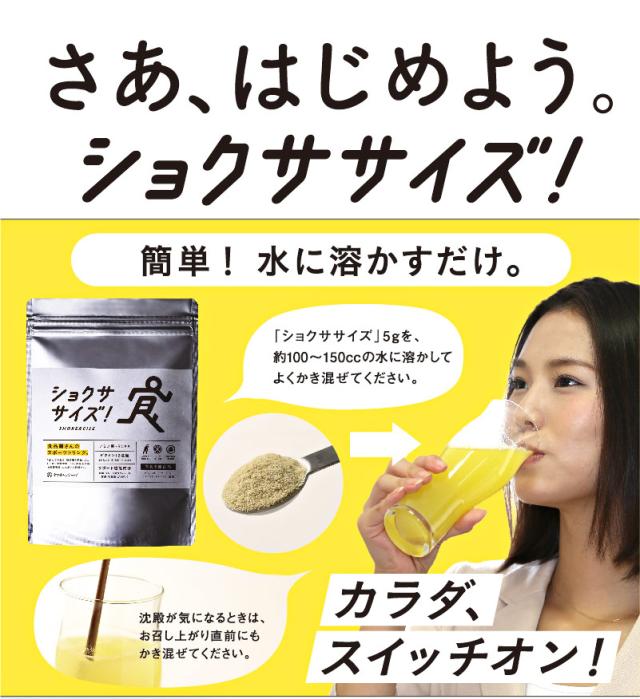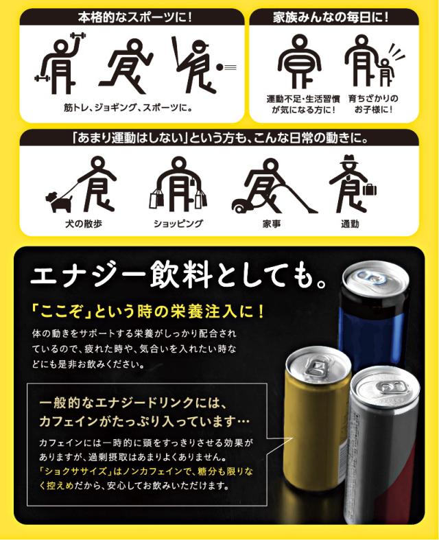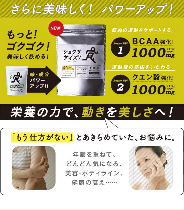 動けば動くほど、キレイになる。食品屋さんが作った砂糖不使用のスポーツドリンク! 美容・健康の上で重要になってくる基礎代謝。代謝を上げるには運動が必要不可欠!しかし、運動をしっかり体に活かすためには、たんぱく質やアミノ酸、ビタミン・ミネラルなどの様々な「栄養のサポート」がとても重要なんです。 ショクササイズは、運動に必要なすべての栄養をバランスよくたっぷり配合しています。 本格的なスポーツから、お掃除・通勤など日常的な動きも、ショクササイズを取り入れてしっかり栄養補給・巡りのサポートを。