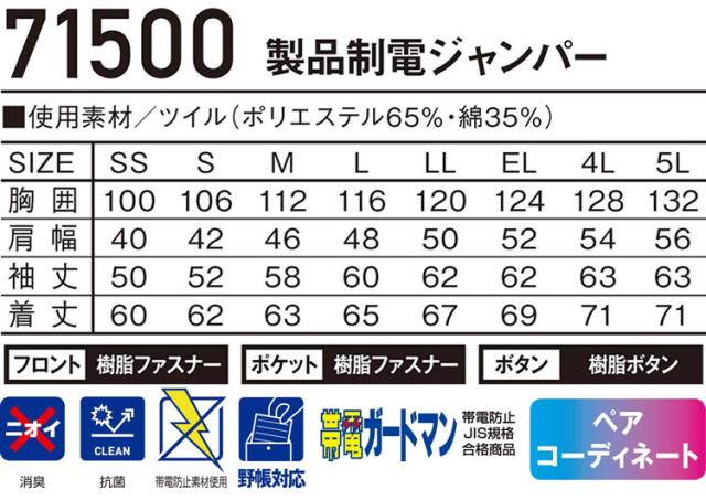Z-DRAGON 製品制電ジャンパー 71500 長袖ブルゾン ジャケット 【秋冬】作業服 作業着 ユニフォーム ユニセックス 自重堂 71500シリーズ