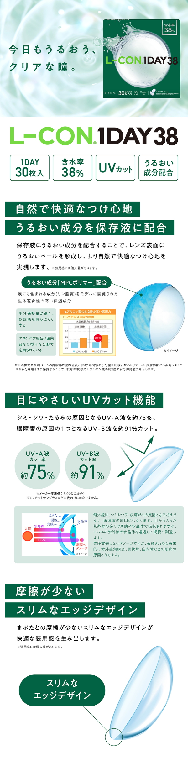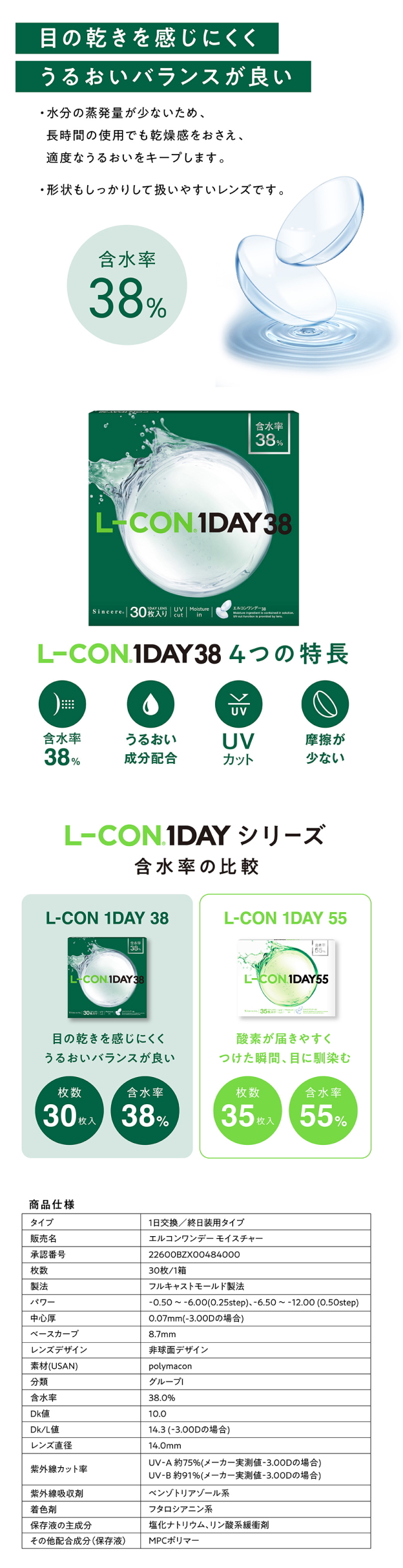 シンシア エルコンワンデー38 2箱 ポスト便 送料無料 1日使い捨て コンタクトレンズ UVカット Sincere L-CON 1DAY38
