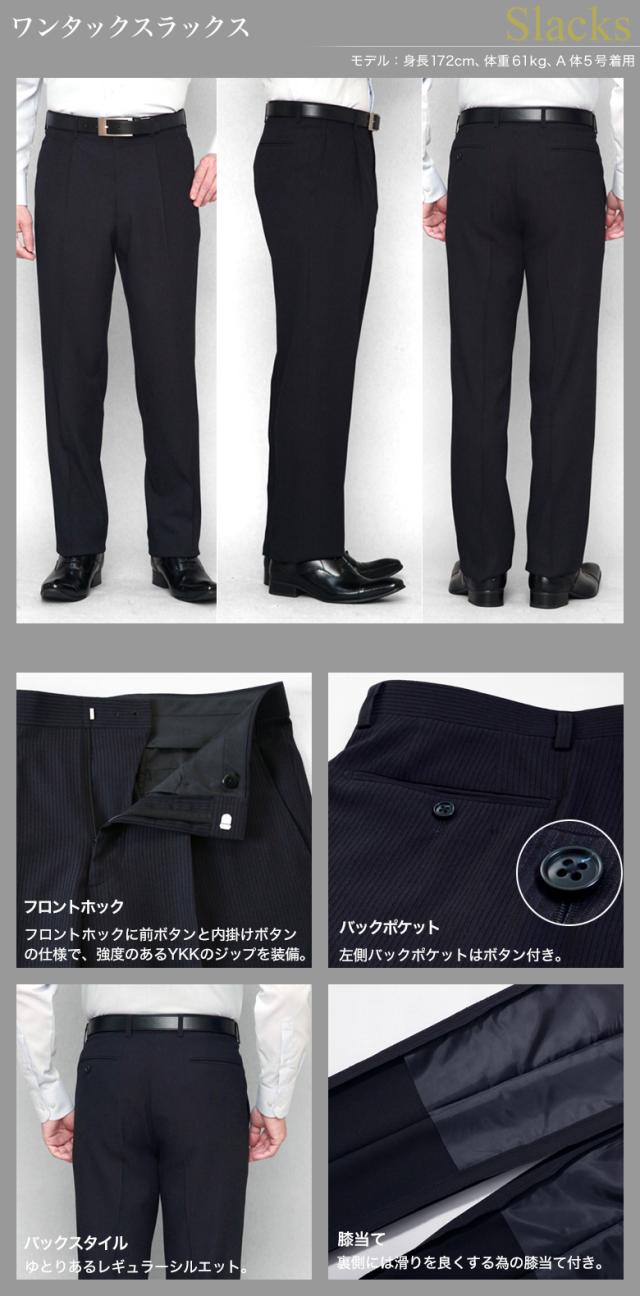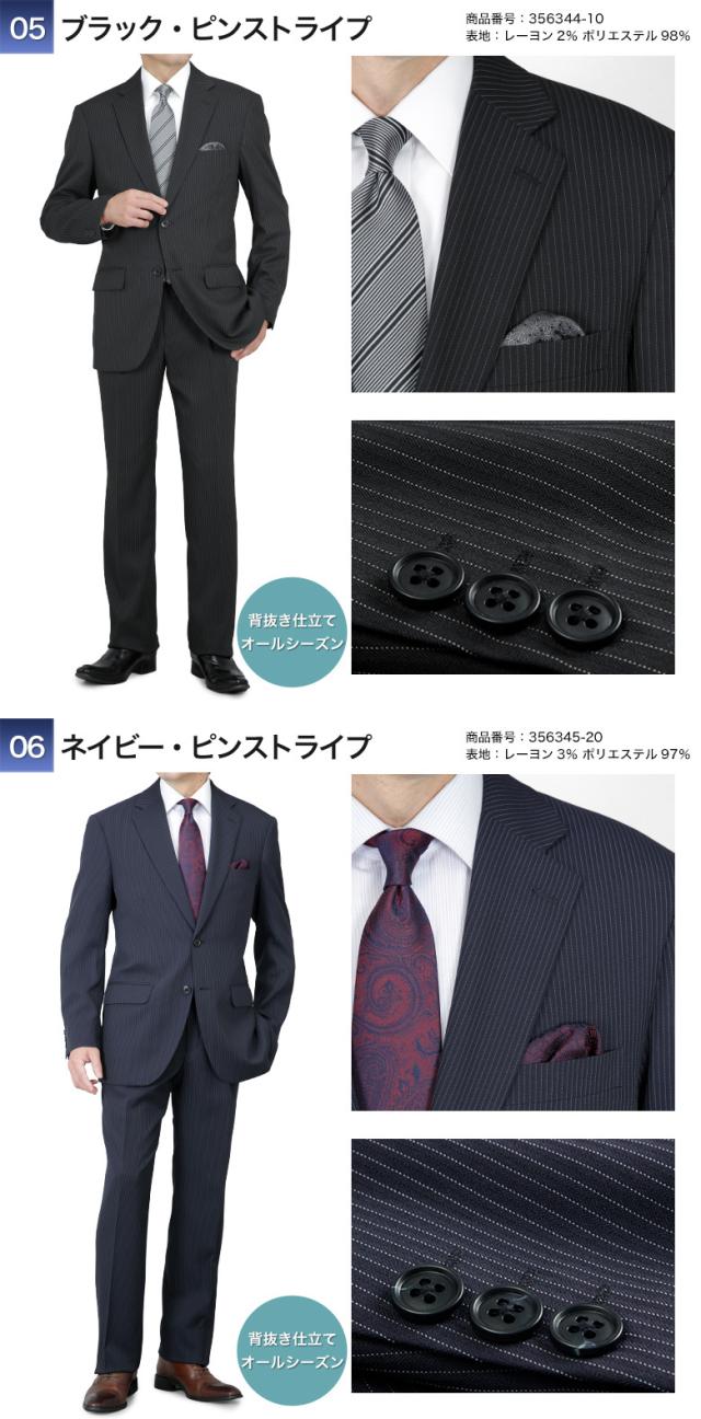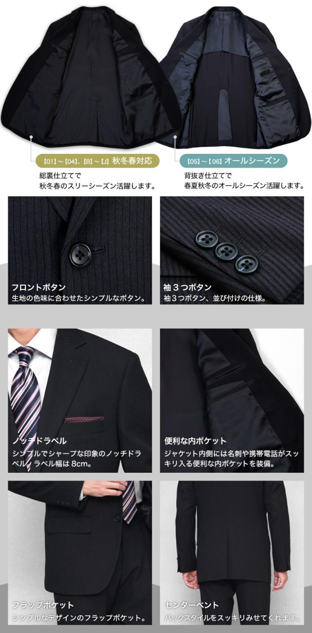 | ▼ジャケット ・2ツボタン ・【01】〜【04】、【B】〜【J】 総裏仕立て ・【05、06】 背抜き仕立て ・袖3ツボタン ・センターベント ▼スラックス ・ワンタック ・ 膝裏付 ・ プリーツ加工 ・ 股シック付 ・上下とも洗濯機で洗えるウォッシャブルタイプ |