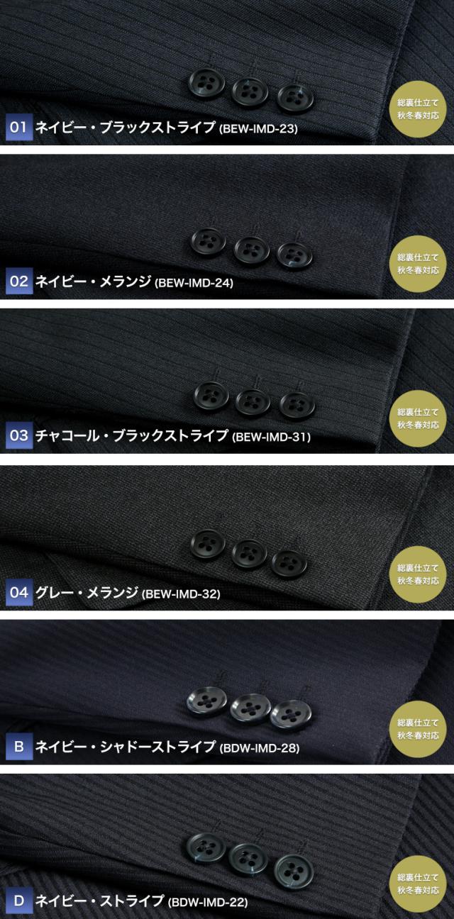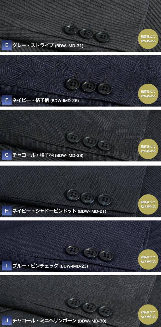 | ▼秋冬春対応 【01】ネイビー・ブラックストライプ(BEW-IMD-23) 【02】ネイビー・メランジ(BEW-IMD-24) 【03】チャコール・ブラックストライプ(BEW-IMD-31) 【04】グレー・メランジ(BEW-IMD-32) 【B】ネイビー・シャドーストライプ(BDW-IMD-28) 【D】ネイビー・ストライプ(BDW-IMD-22) 【E】グレー・ストライプ(BDW-IMD-31) 【F】ネイビー・格子柄(BDW-IMD-26) 【G】チャコール・格子柄(BDW-IMD-33) 【H】ネイビー・シャドーピンドット(BDW-IMD-21) 【I】ブルー・ピンチェック(BDW-IMD-23) 【J】チャコール・ミニヘリンボーン(BDW-IMD-30) ▼オールシーズン対応 【05】ブラック・ピンストライプ(356344-10) 【06】ネイビー・ピンストライプ(356345-20) 2025年9月より色柄を追加して販売しています |