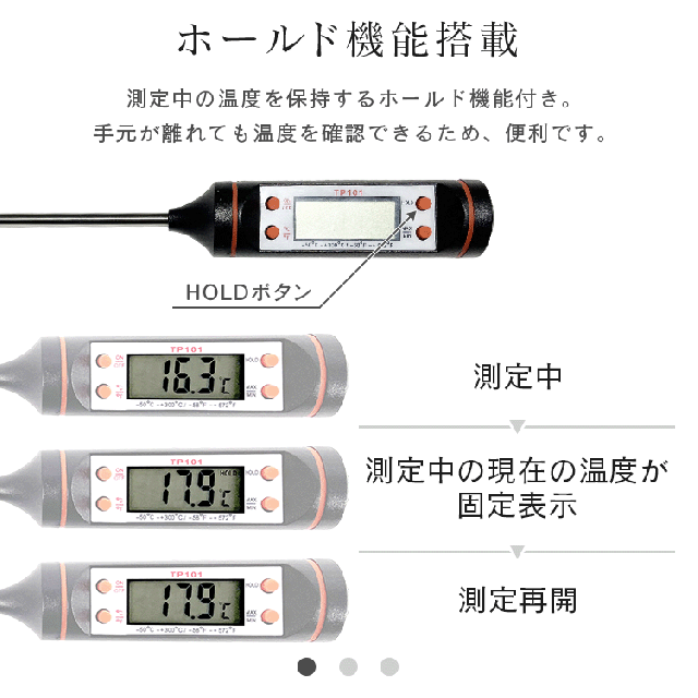 ■ホールド機能で測定中の現在の温度が固定表示されます