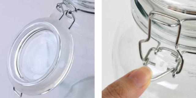 ガラスとフタのワイヤー金具がスタイリッシュな組み合わせです。 本体はガラス製なので水できれいに洗えます。