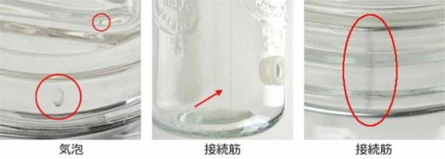 製造工程上、機械でついた擦り傷・鋳型傷、しわのような傷がある場合がございます。また、若干の気泡・微量の混入物や汚れがある場合がございますが、強度や食品衛生上は問題ございません。また、底面の凹凸は個体差があります。